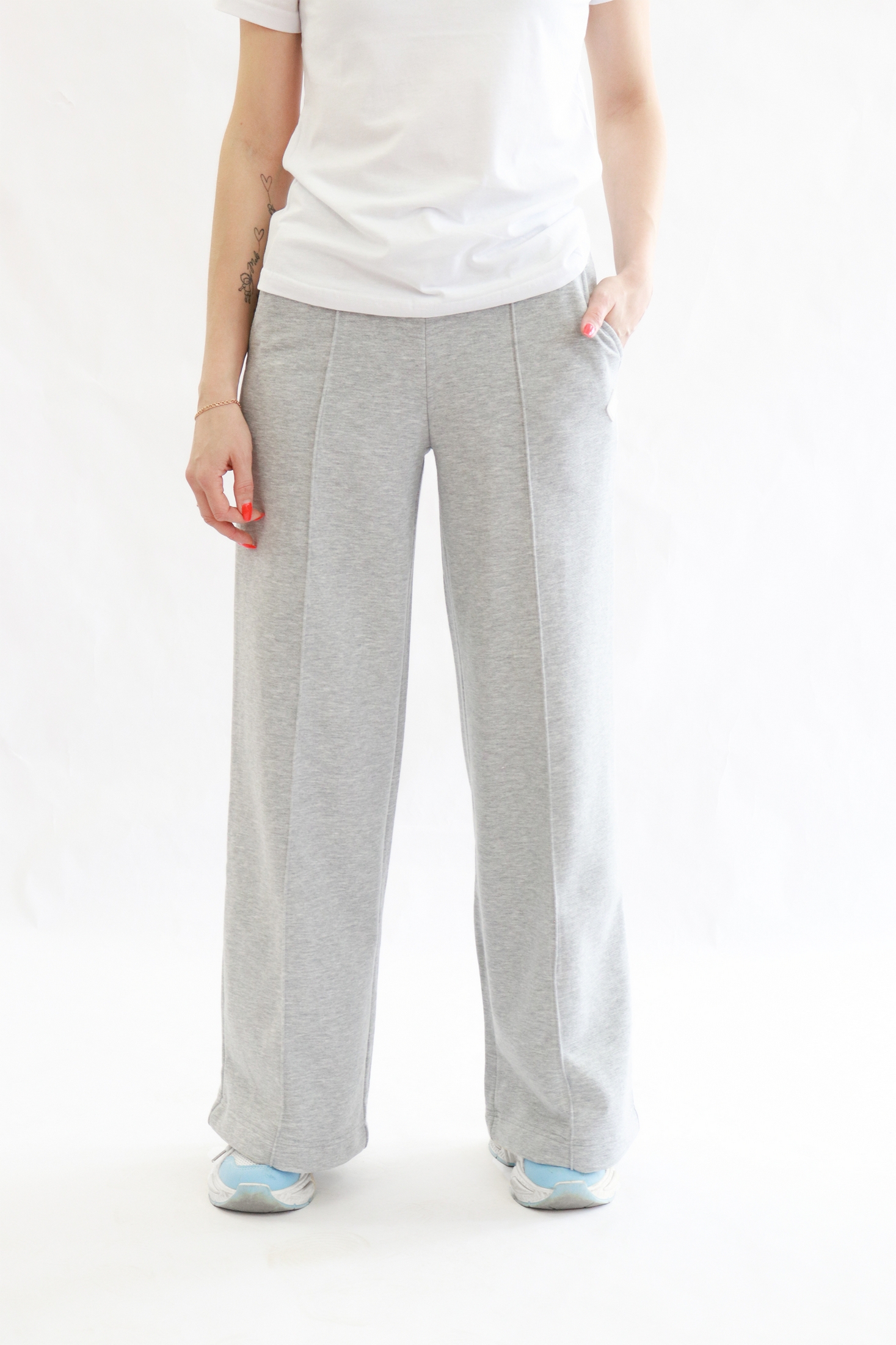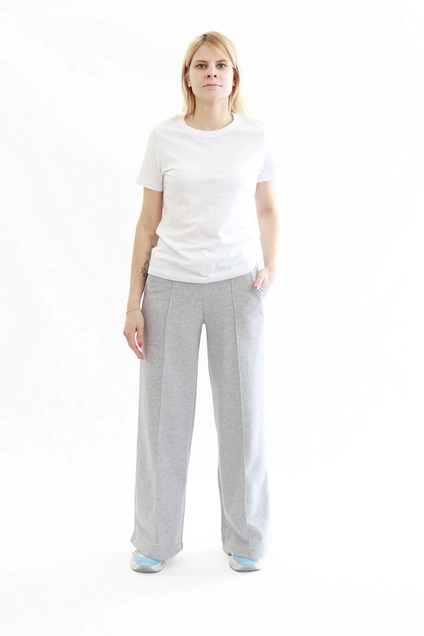 Элегантные женские брюки палаццо светло-серого цвета великолепно дополнят ваш гардероб. Модель выполнена из мягкого текстиля, что обеспечивает комфорт на весь день. Талия на удобной резинке идеально садится по фигуре, а боковые карманы добавляют функциональности. Особый акцент — стрелки на передней части, придающие изделию аккуратный вид. С левой стороны, в районе кармана, расположена деликатная эмблема, подчеркивающая бренд. Эти брюки станут идеальным выбором для создания как повседневных, так и более официальных образов.