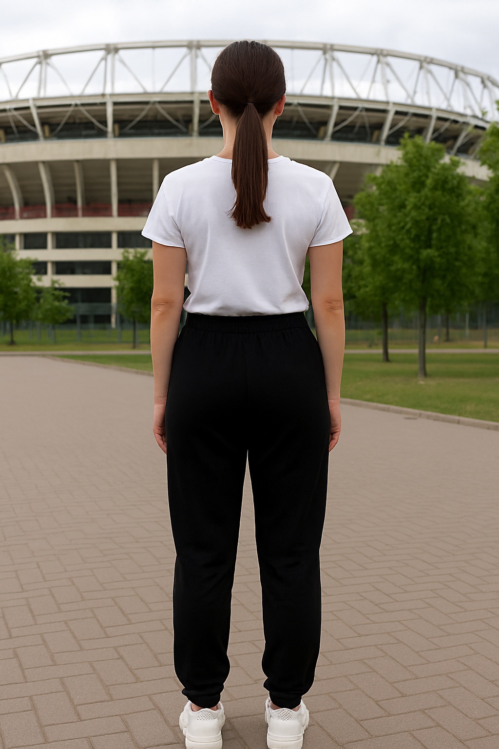 Эти стильные черные брюки – идеальный выбор для активного образа жизни. Изготовленные из мягкой ткани с начесом, они обеспечивают комфорт и тепло в прохладные дни. Брюки имеют удобную резинку на талии и по нижнему краю, что делает их простыми в носке и адаптируемыми к различным фигурам. Светоотражающая термоапликация на боку добавляет элемент безопасности при вечерних пробежках или поездках на велосипеде. Функционально дополнены боковыми карманами, эти брюки отлично сочетаются как с спортивными, так и с повседневными аутфитами.