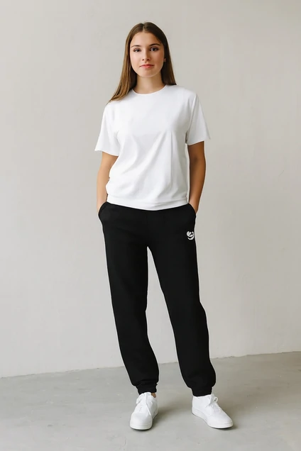 Эти стильные черные брюки – идеальный выбор для активного образа жизни. Изготовленные из мягкой ткани с начесом, они обеспечивают комфорт и тепло в прохладные дни. Брюки имеют удобную резинку на талии и по нижнему краю, что делает их простыми в носке и адаптируемыми к различным фигурам. Светоотражающая термоапликация на боку добавляет элемент безопасности при вечерних пробежках или поездках на велосипеде. Функционально дополнены боковыми карманами, эти брюки отлично сочетаются как с спортивными, так и с повседневными аутфитами.