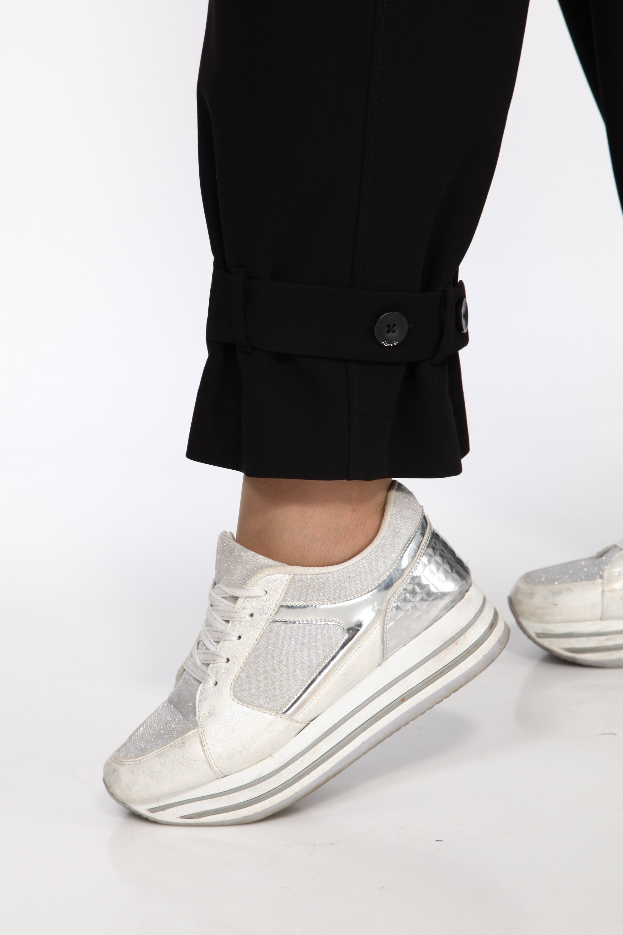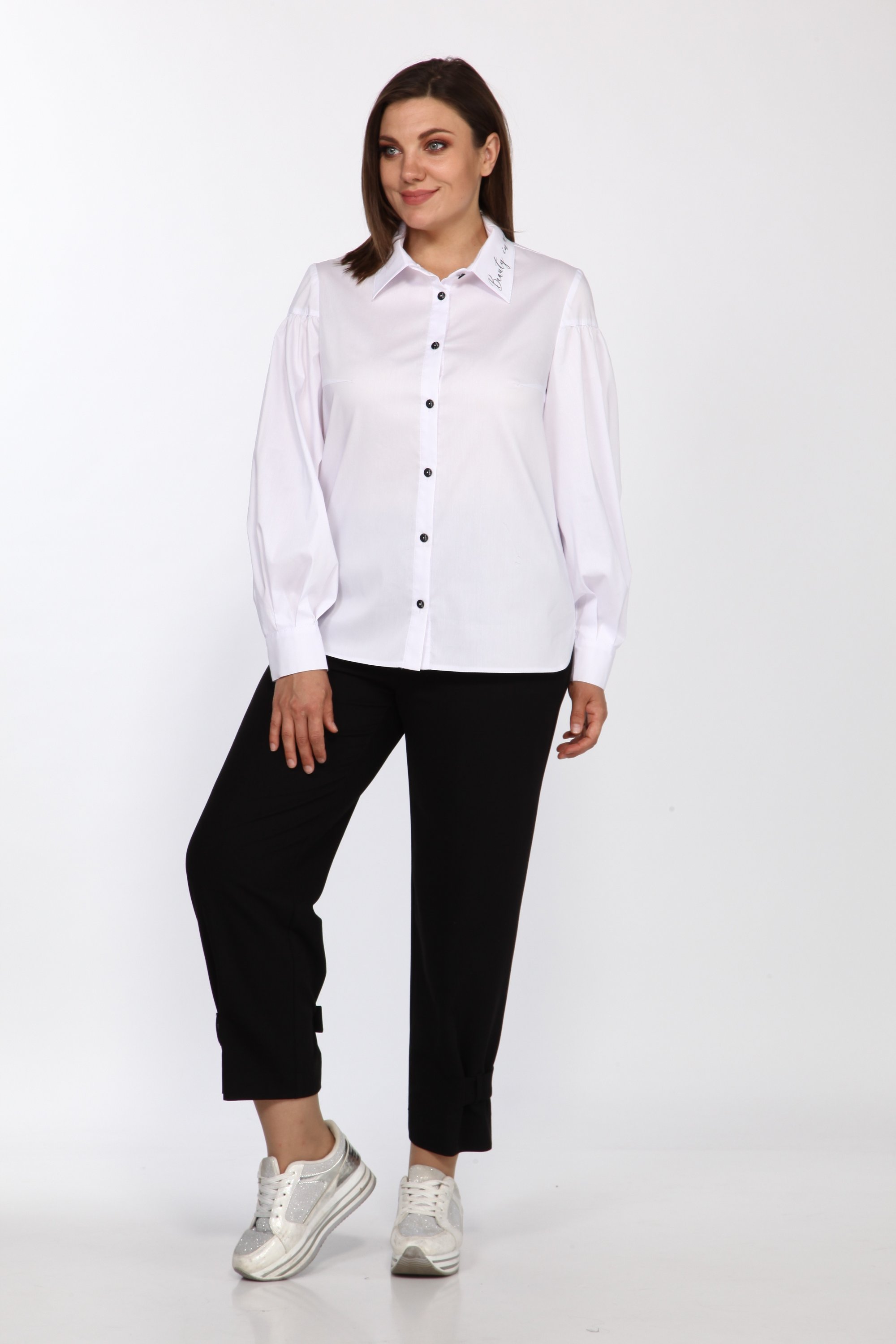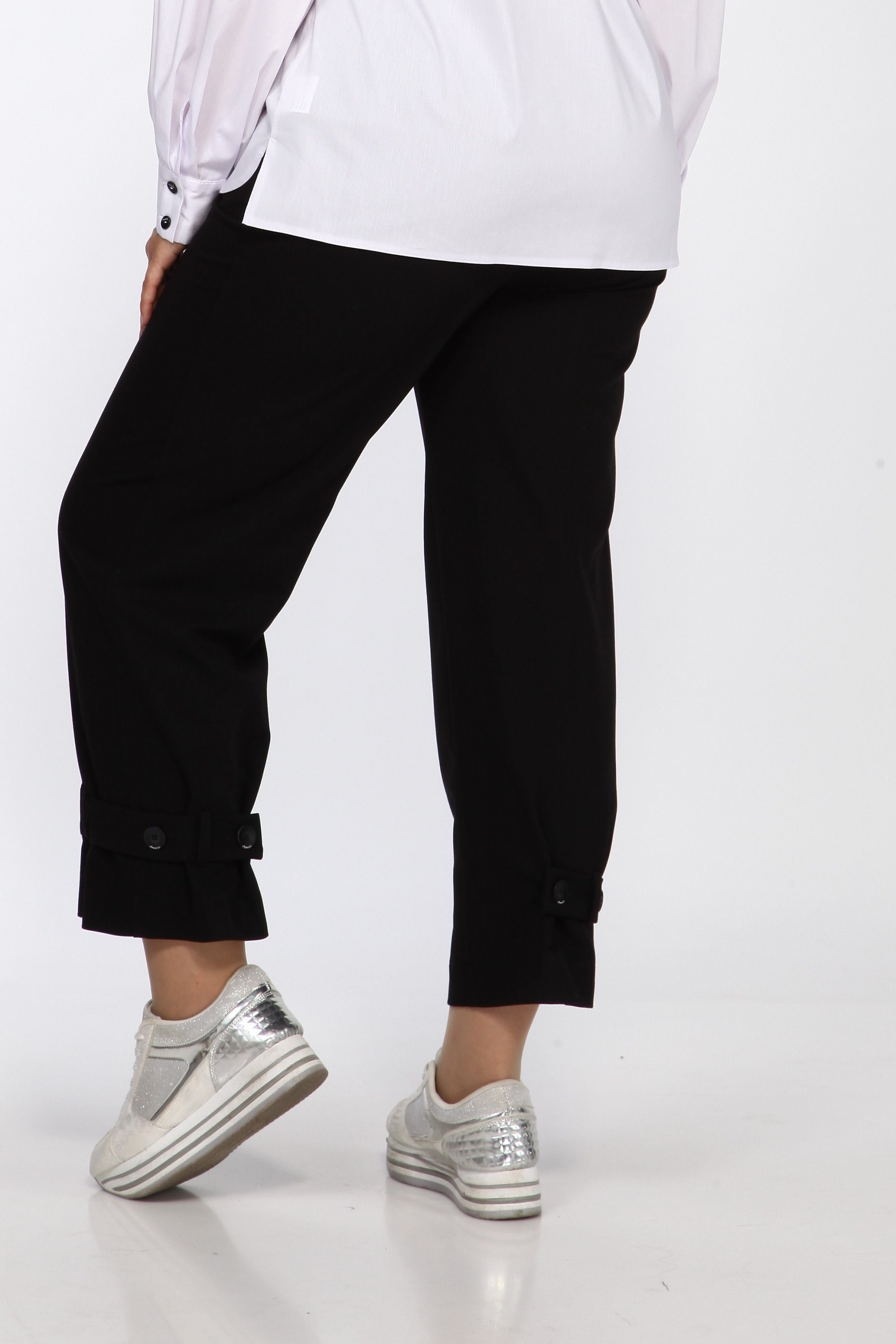 Стильные женские брюки из комфортной поливискозной ткани. брюки расширенны к низу и собраны на широкую пату с пуговицами. В боковых швах на уровне бедер обработаны наклонные карманы с подрезным бочком. Застежка по линии банта на молнию. Брюки на поясе с резинкой по спинке.