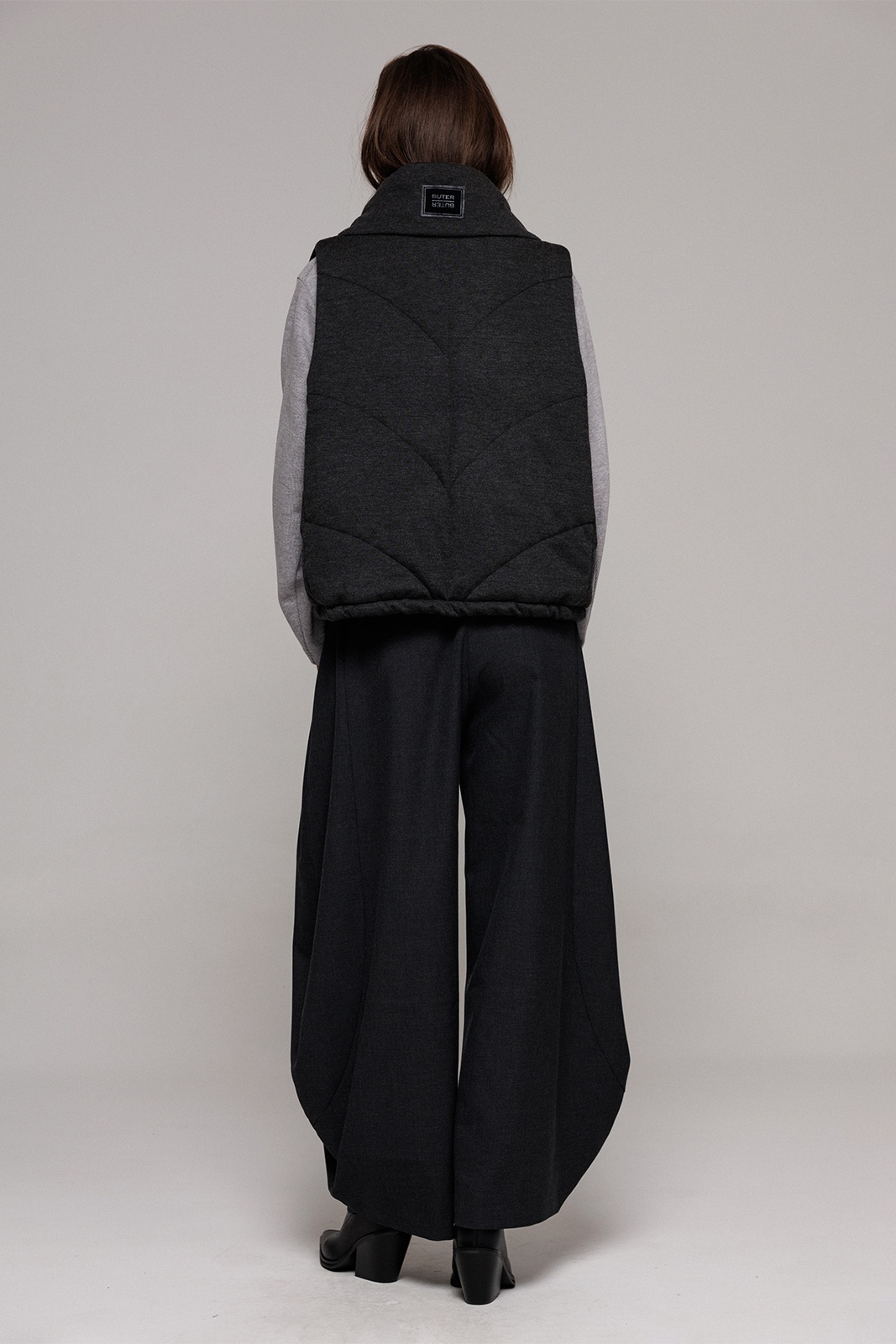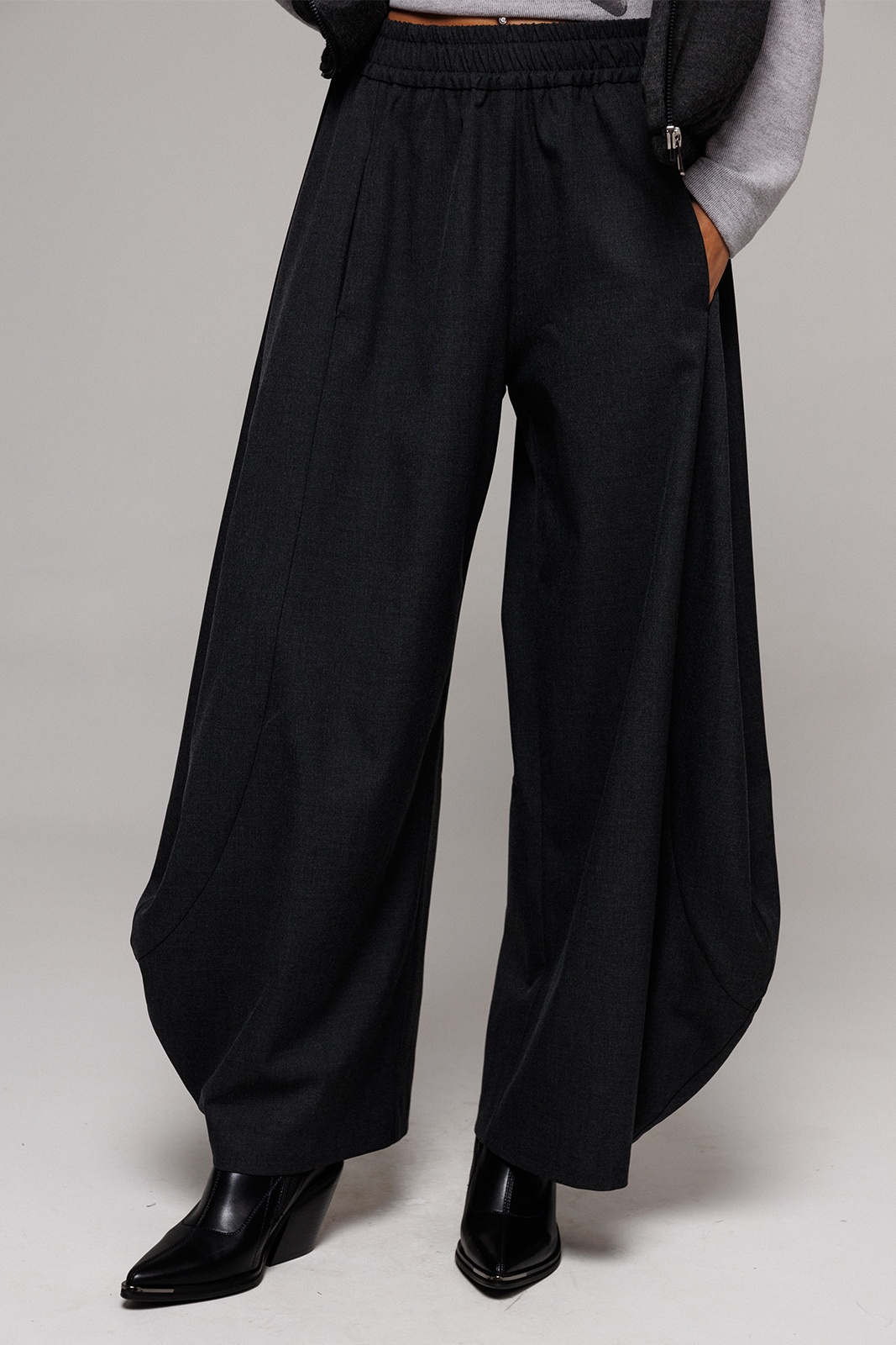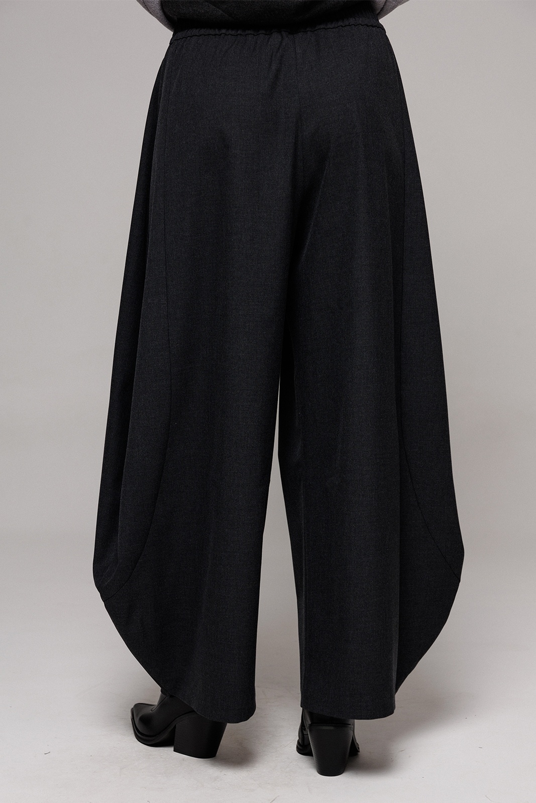 Брюки-шаровары из костюмной ткани свободного силуэта, зауженные к низу, на притачном отсроченном поясе со вставленной в него резинкой. Полочка с карманом в рельефе. По переду и спинке фигурные рельефы.
