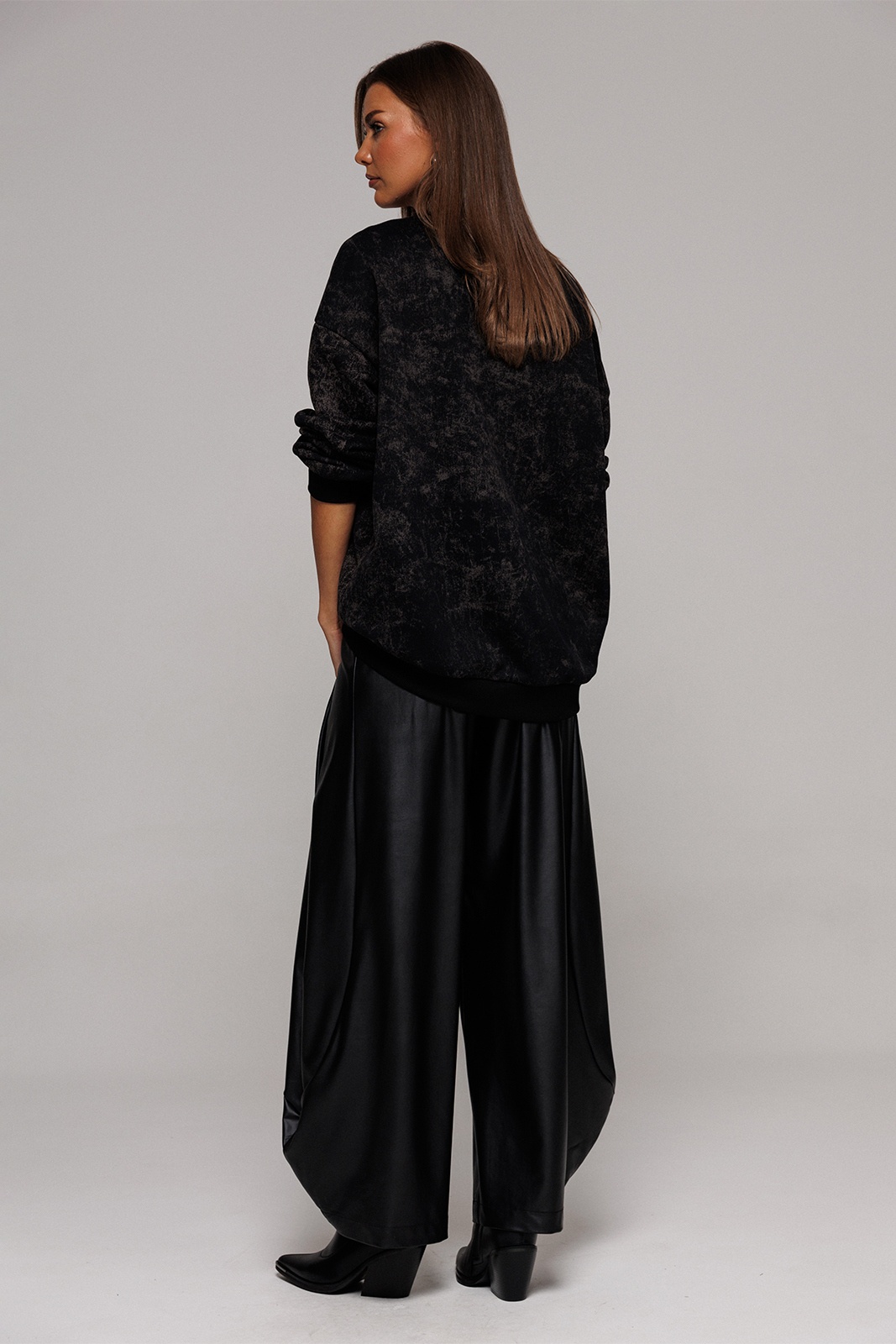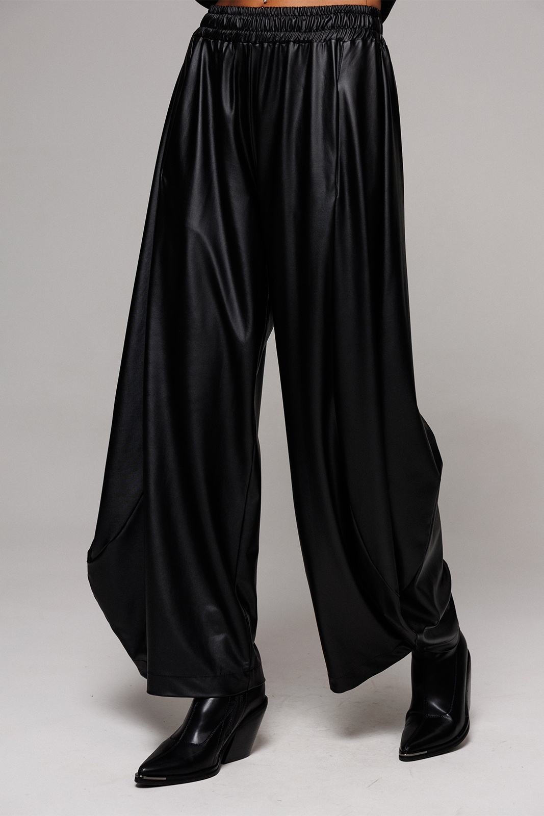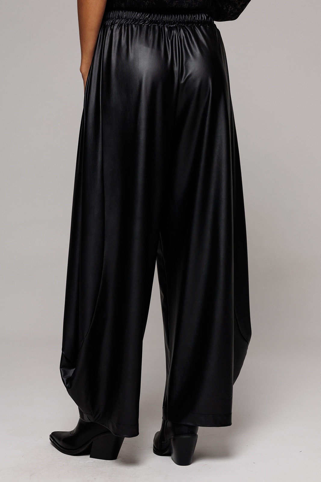 Элегантные женские брюки-шаровары из качественной эко-кожи черного цвета, представляют собой идеальный выбор для создания современного и стильного образа. Брюки имеют свободный силуэт, который заужен к низу, обеспечивая актуальный геометрический вид и добавляя изысканности в наряд. Модель оснащена удобным притачным поясом на отсрочке с встроенной резинкой для идеальной посадки. Фигурные рельефы как на передней, так и на задней части брюк добавляют объема и изящества силуэту. В деталях дизайна выделяется полочка с оригинальным карманом в рельефе, что делает эту модель не только практичной, но и визуально привлекательной. Эти брюки будут отлично смотреться как в деловых, так и в более неформальных образах.