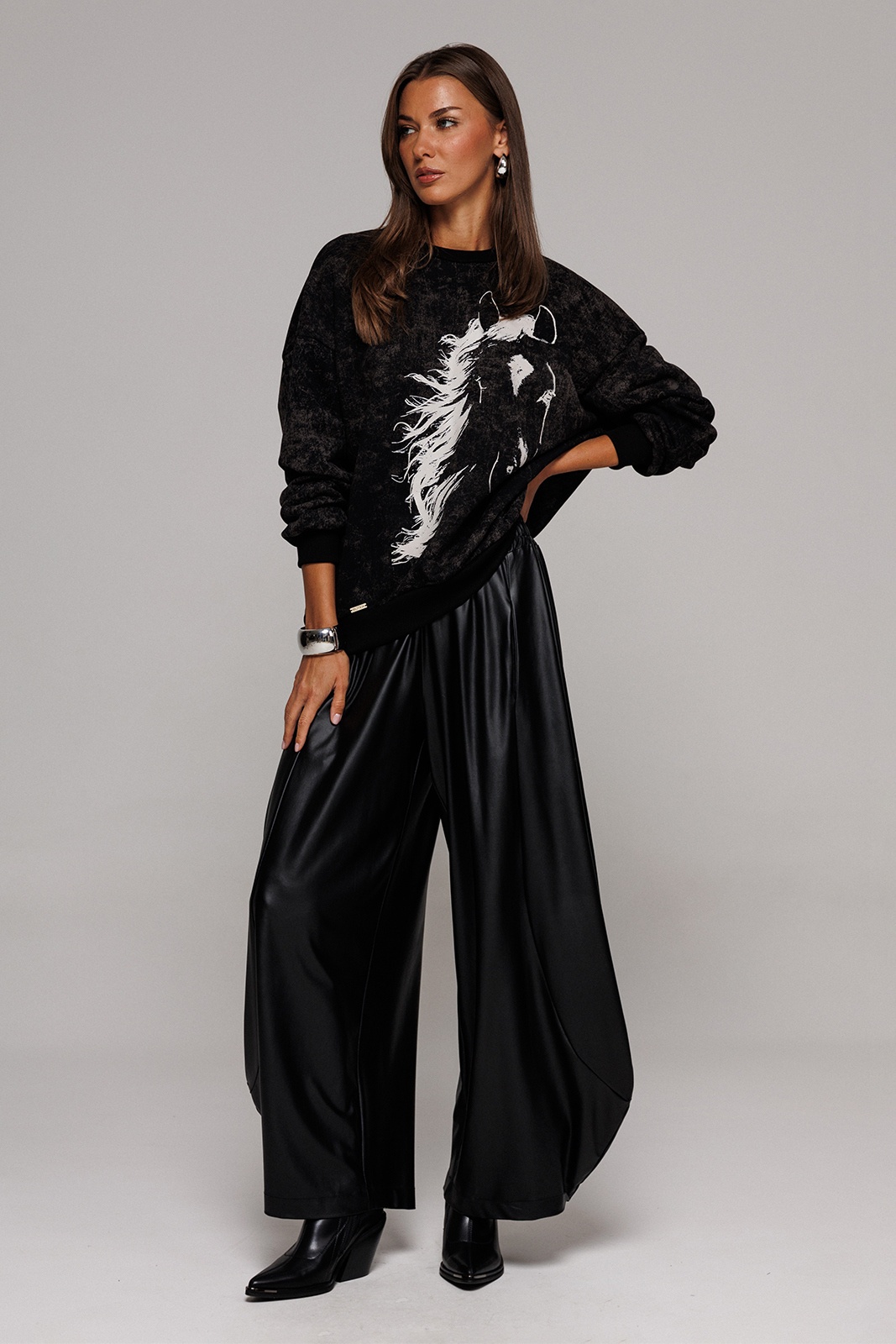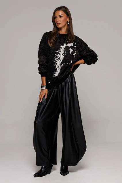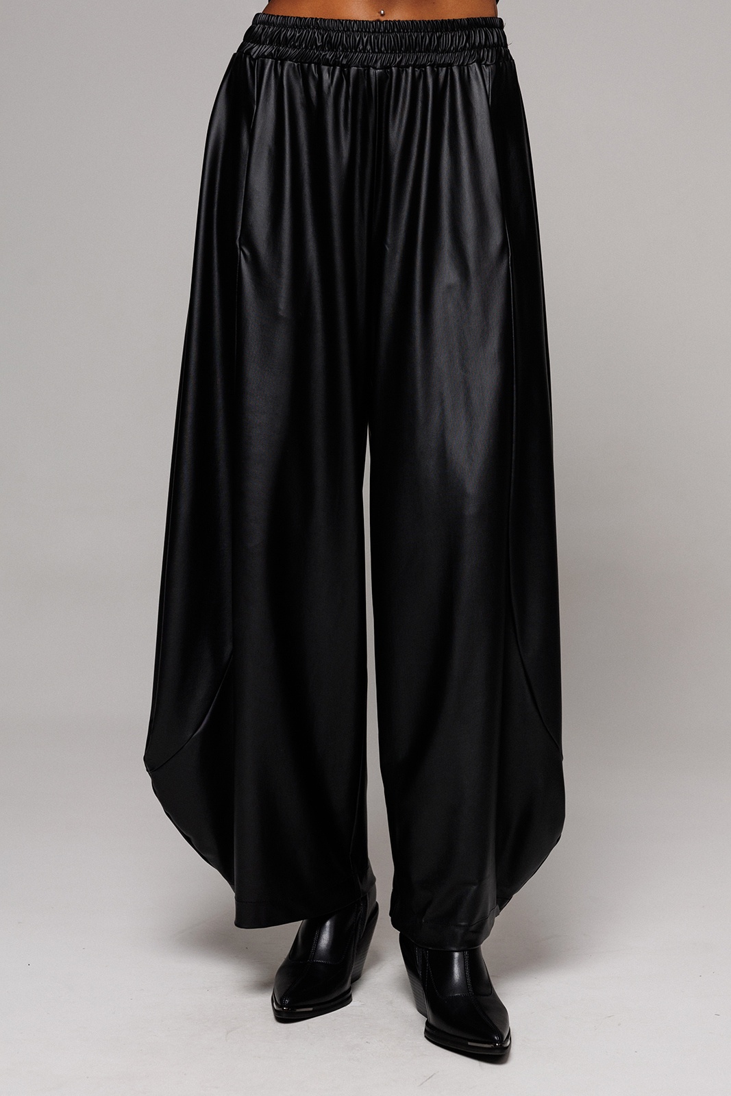 Элегантные женские брюки-шаровары из качественной эко-кожи черного цвета, представляют собой идеальный выбор для создания современного и стильного образа. Брюки имеют свободный силуэт, который заужен к низу, обеспечивая актуальный геометрический вид и добавляя изысканности в наряд. Модель оснащена удобным притачным поясом на отсрочке с встроенной резинкой для идеальной посадки. Фигурные рельефы как на передней, так и на задней части брюк добавляют объема и изящества силуэту. В деталях дизайна выделяется полочка с оригинальным карманом в рельефе, что делает эту модель не только практичной, но и визуально привлекательной. Эти брюки будут отлично смотреться как в деловых, так и в более неформальных образах.