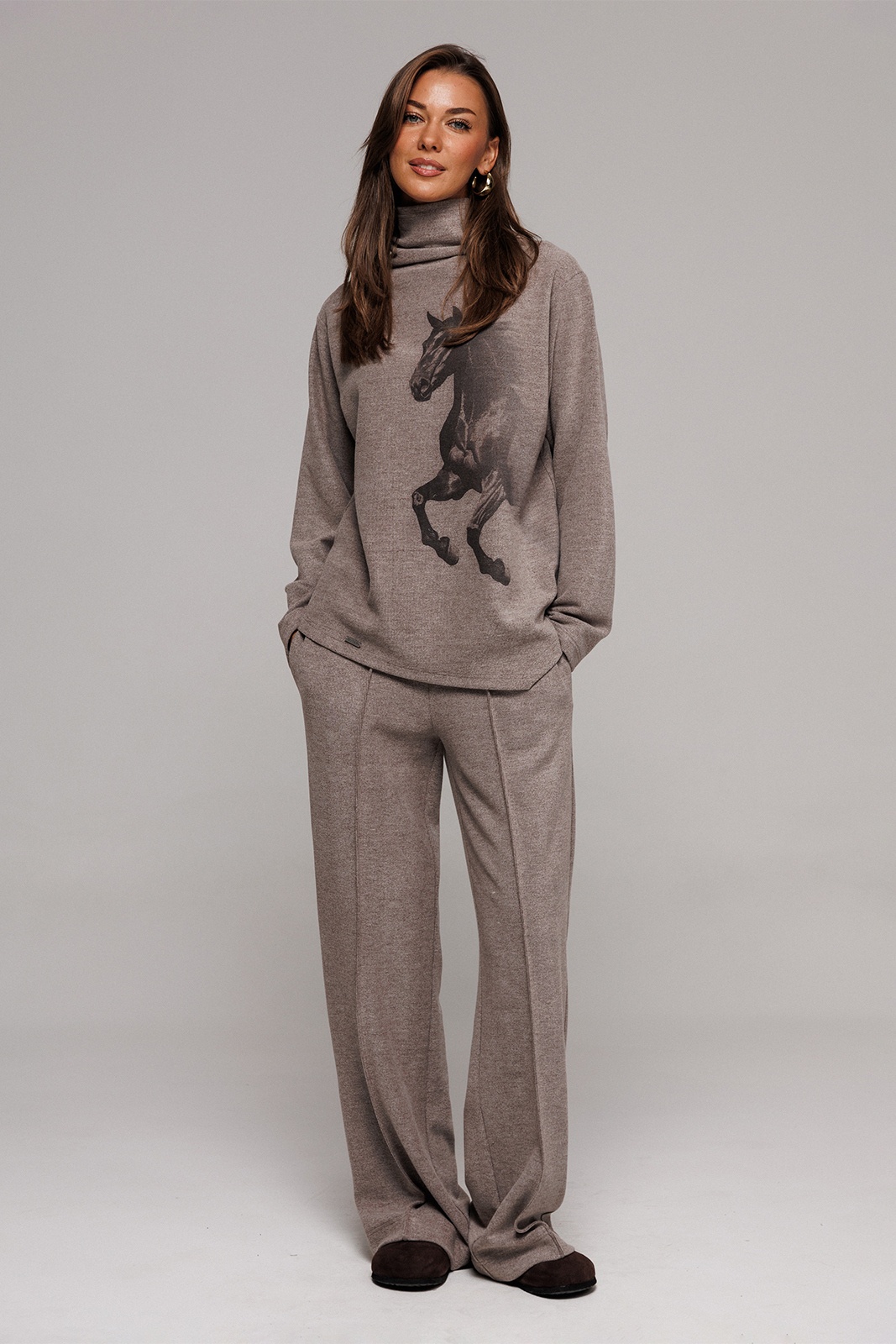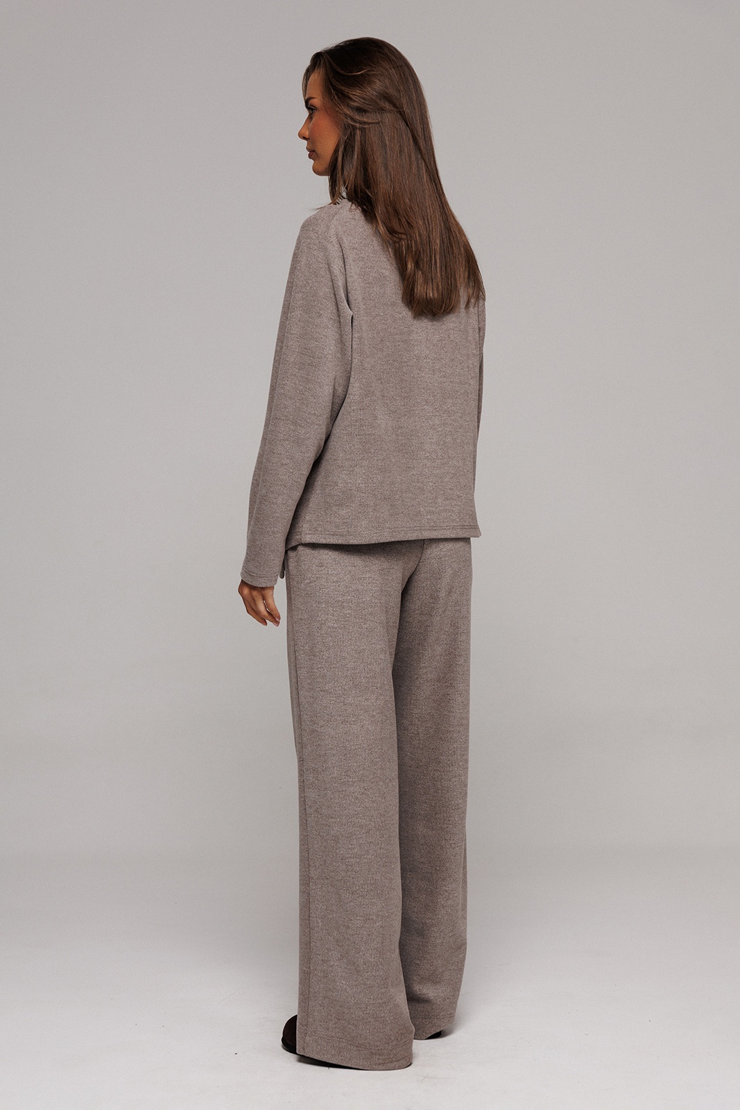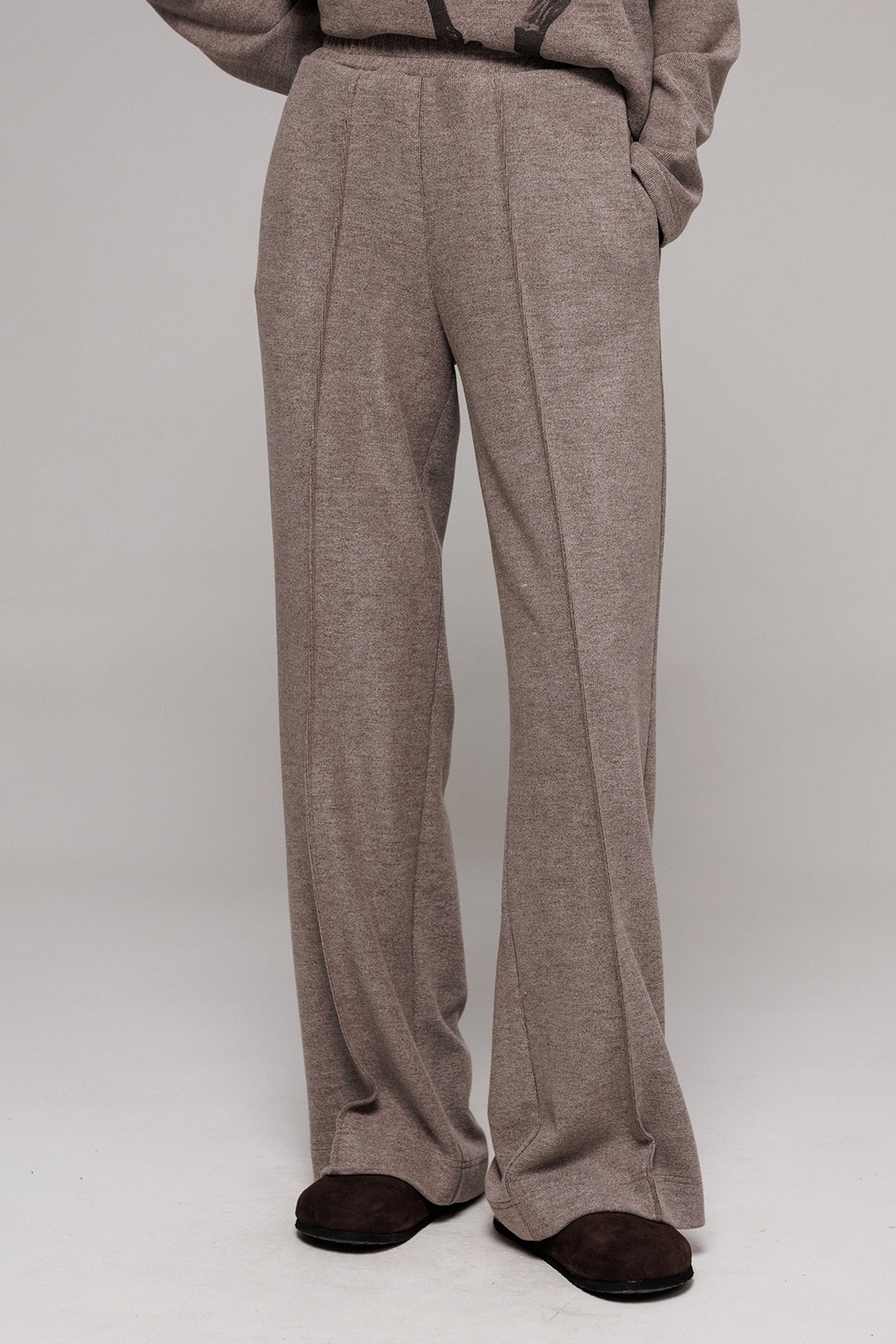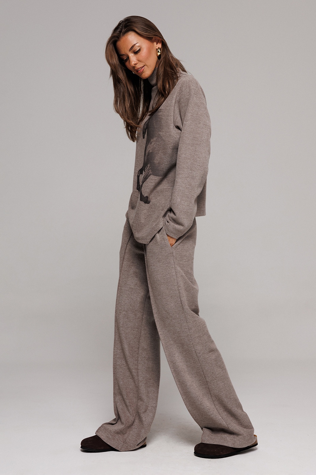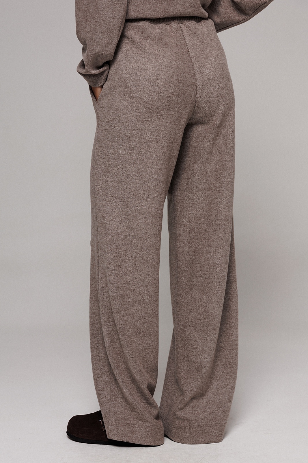 Эти элегантные брюки из мягкого трикотажного полотна с велюровым эффектом представлены в приглушённом сером цвете, добавляя теплоту и уют вашему образу. Прямой крой гарантирует комфортное прилегание и одновременно стильный вид. Модель оснащена притачным поясом, аккуратно отстроченным, с вставленной в него резинкой для оптимальной посадки на талии. Нежные защипы, идущие от пояса до низа брюк, создают изящный драпированный эффект. Функциональные вставные карманы в боковых швах удобны для ношения мелких предметов. Эти брюки идеально подойдут для создания спокойных и утонченных ансамблей.