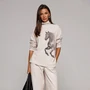 Брюки-палаццо, комбинированные из костюмной ткани по переду и джинса по спинке. Брюки на притачном поясе со шлевками и застежкой-гульфик. Пояс застегивается на петлю-пуговицу. По переду со складками и заутюженной стрелкой от одной из складок по всей длине брюк и карманами в боковых швах с наклонным входом. По спинке кокетка, накладные карманы и заутюженная стрелка.
