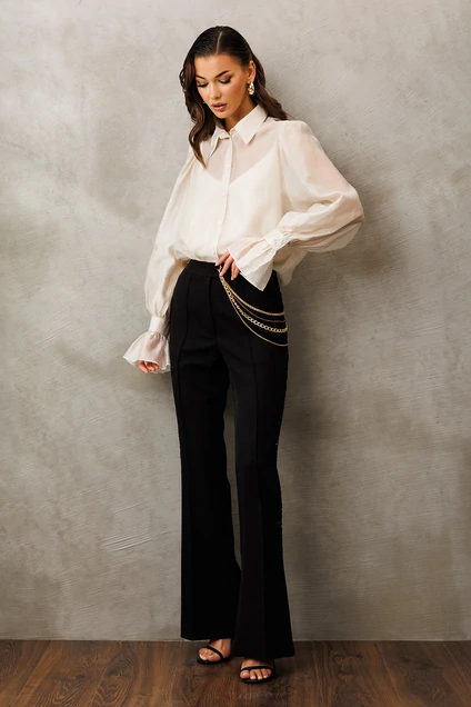 Брюки-клеш из костюмной ткани с лампасом из пайеток. Брюки на притачном поясе с уступом и застежкой-гульфик. Пояс застегивается на крючок и потайную петлю-пуговицу. По переду защип по всей длине брюк и карманами в шве притачивания к лампасу. По спинке вытачка от пояса.