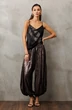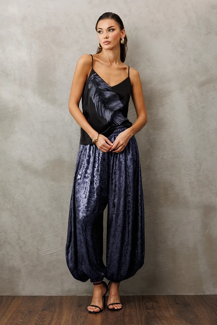 Эти стильные брюки-шаровары выполнены из ткани с эффектом металлического блеска насыщенного синего цвета, что добавляет изделию роскоши. Модель отличается свободным силуэтом и низом на комфортной резинке, обеспечивающей идеальную посадку. Дизайн дополнен притачным отсроченным поясом с внутренней резинкой для наилучшей фиксации. Карман на полочке в рельефе удобен и практичен, а фигурные рельефы по переду и спинке придают брюкам уникальный и современный вид. Эти брюки станут идеальным выбором для создания эффектного и запоминающегося образа.