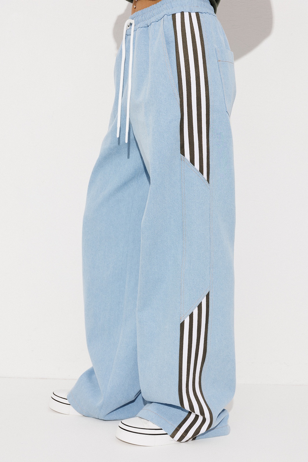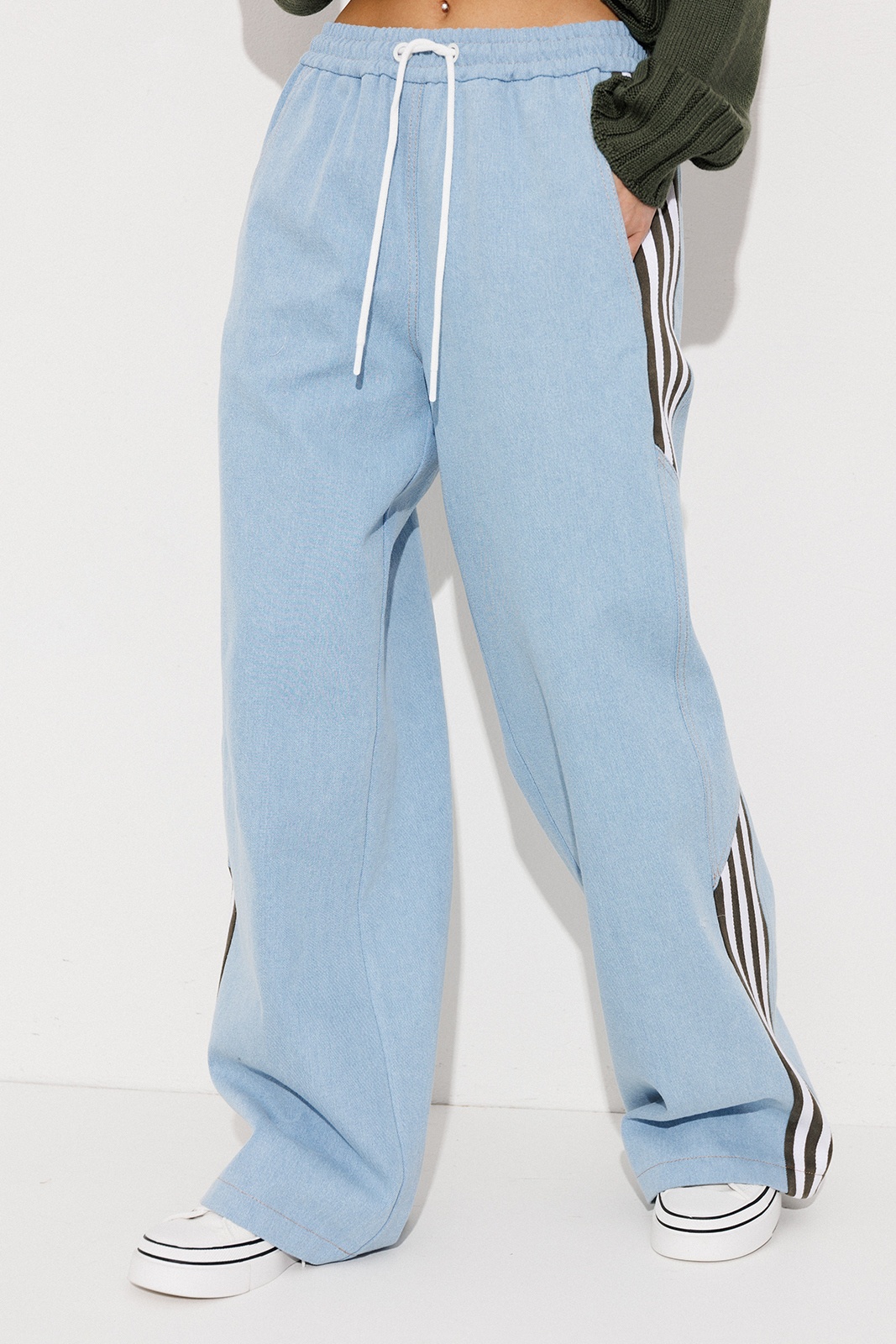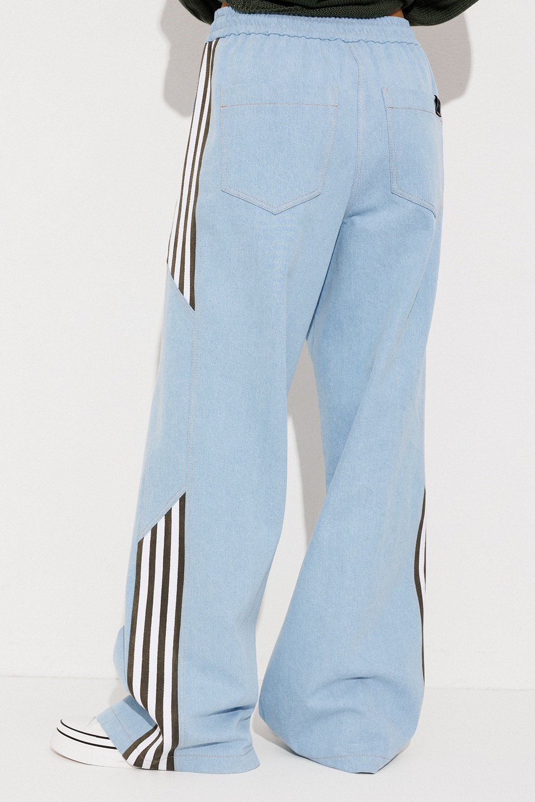 Брюки-джинсы, комбинированные, прямого силуэта. На притачном отстроченном поясе с втянутым в него декоративным шнурком. Перед и спинка выполнены из джинса. По переду карманы в шве с наклонным входом. По спинке накладные карманы с нашивкой "BUTER". По бокам отрезной бочок, комбинированный из замшевой отделочной ткани, по которой отстрочено 3 узких лампаса и центральная вставка из джинса.