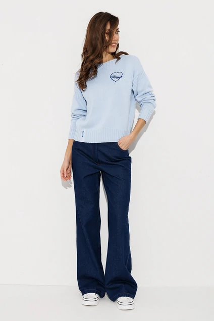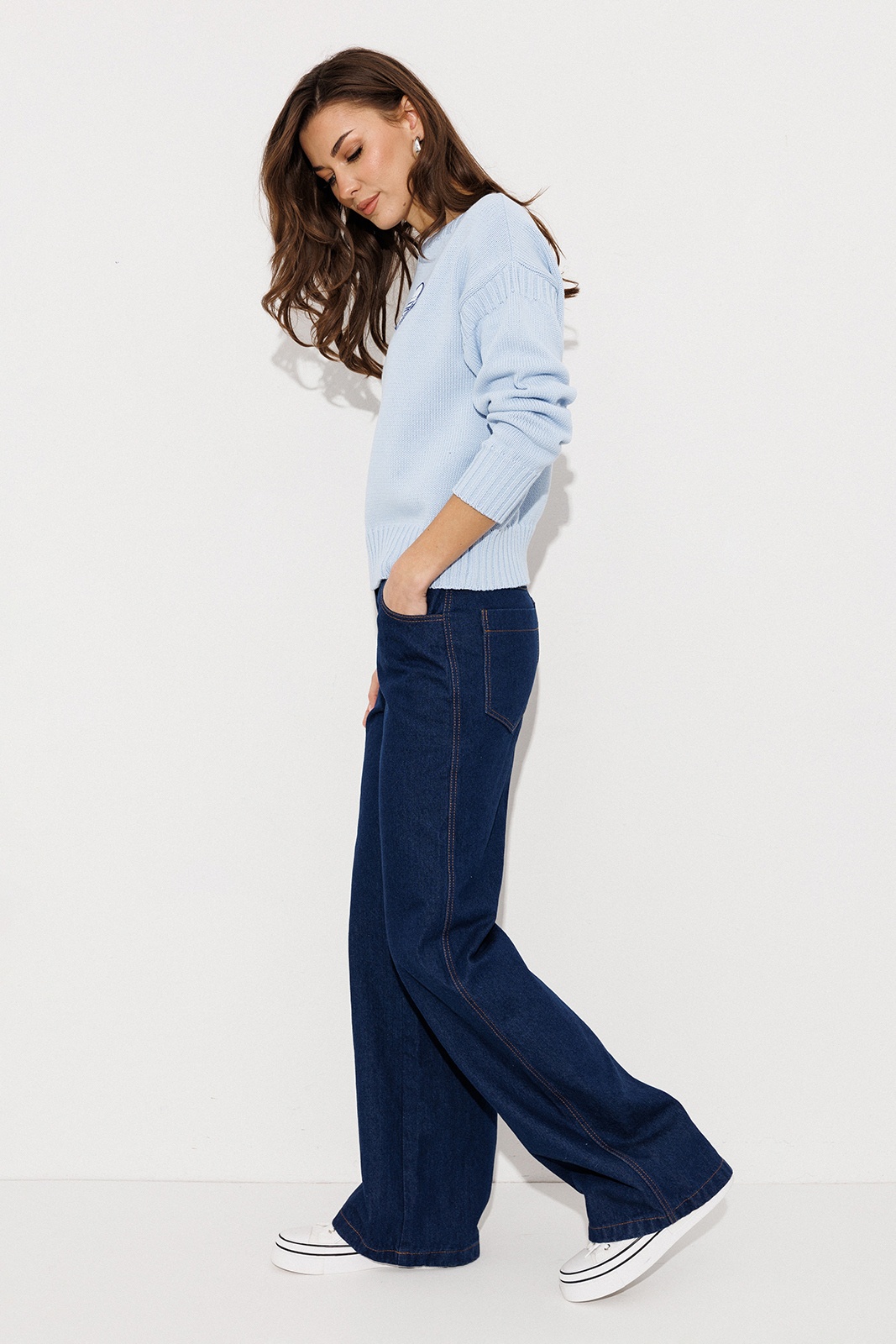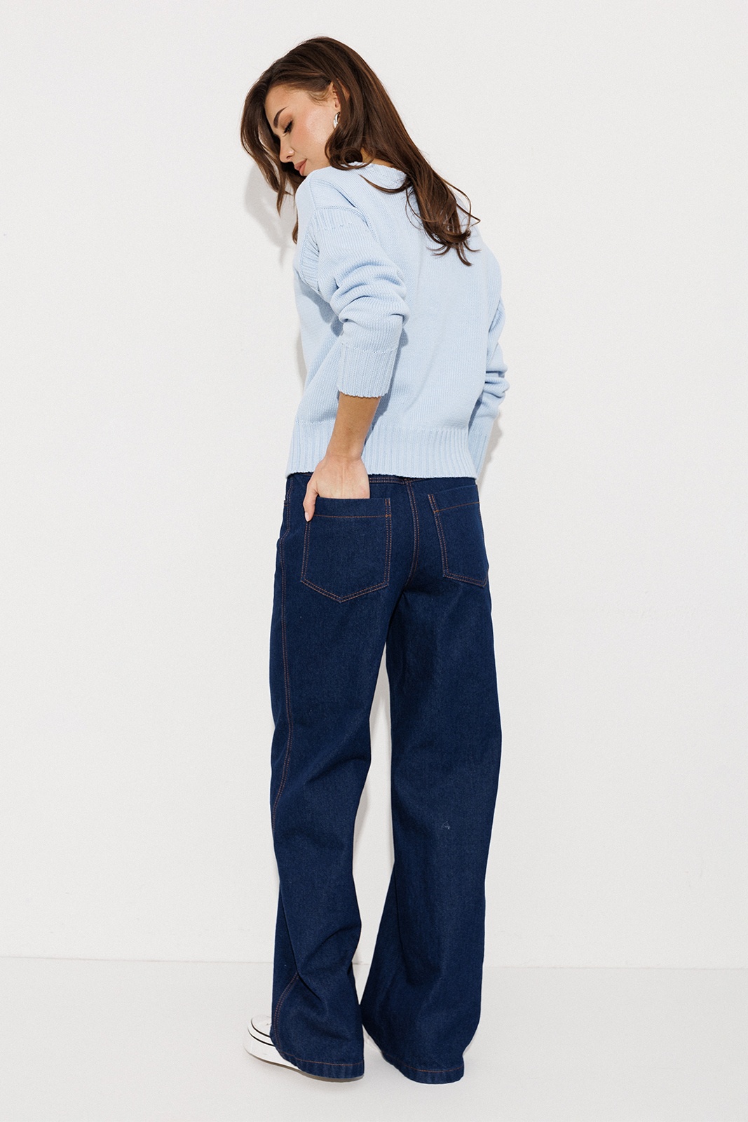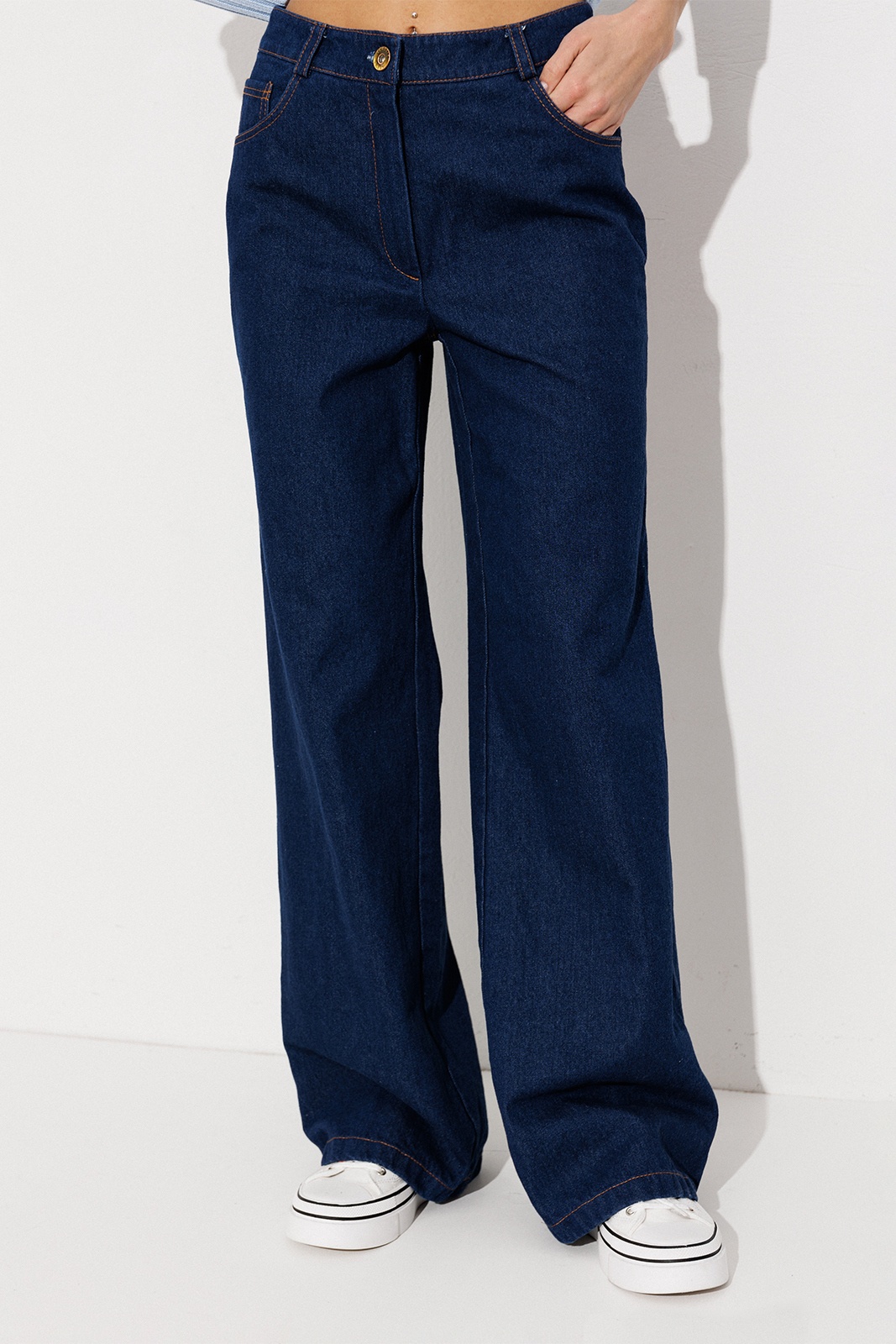 Брюки-джинсы прямого силуэта. На притачном поясе со шлёвками, застежкой-гульфик. Пояс застегивается на петлю-пуговицу. По переду карманы. По спинке кокетка, накладные карманы.