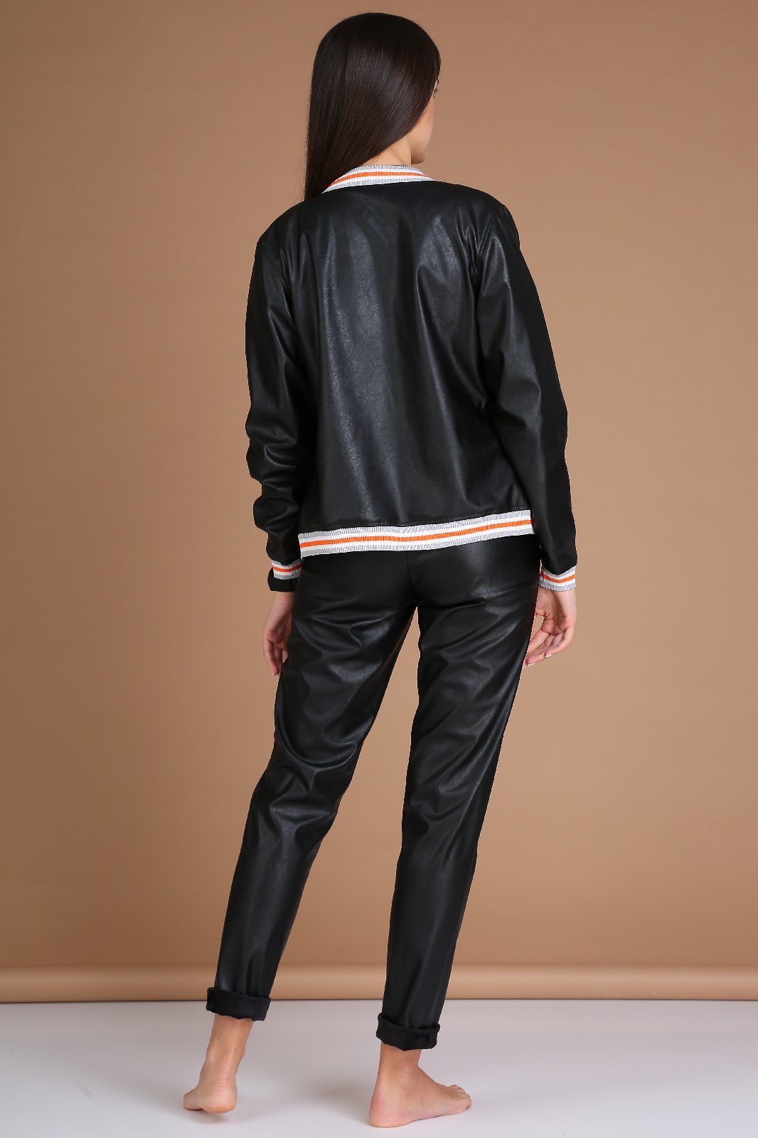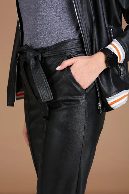 Брюки прямые, чуть заужены к низу. По переду отстрочены стрелки. Пояс притачной сзади на резинке, по задним половинкам обработана кокетка. В комплекте идет съёмный пояс. Изделие выполнено из экокожи высокого качества, изнанка в ткани замш, ткань стрейч.