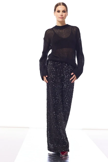 Брюки свободного силуэта на трикотажной подкладке , вверху брюк эластичная тесьма.