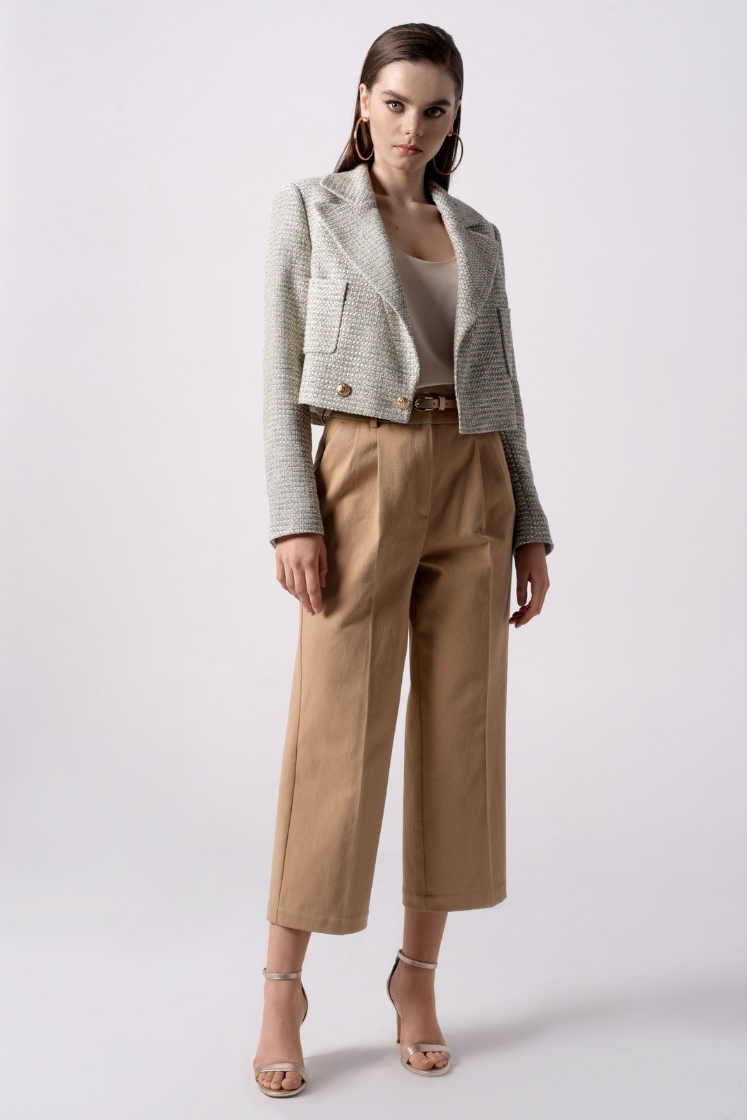 Элегантные брюки прямого кроя – идеальный выбор для создания стильного образа. Изготовленные из качественного материала, эти брюки обеспечивают не только исключительный комфорт, но и подчеркивают утончённость вашего стиля. Длина до середины икры делает их универсальными для сочетания как с обувью на каблуке, так и с более повседневной обувью. Высокая талия подчеркивается элегантным поясом с пряжкой, добавляя акцент в общий силуэт и позволяя моделировать фигуру. Брюки оснащены боковыми карманами, которые удобны и практичны. Эта модель идеально подходит как для офиса, так и для вечернего выхода, обеспечивая вам уверенность в каждой детали вашего наряда.