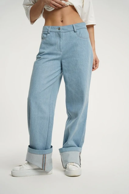 Джинсы выполнены в мягком синем оттенке и дополнены широкими отворотами по низу, что добавляет изящества силуэту. Продуманные детали включают фигурные карманы на передней части и накладные карманы с кокетками на задней стороне, что придает дополнительную универсальность и практичность. Застежка на молнию, дополненная петлей и пуговицей, обеспечивает надежную и удобную посадку. Отрезной пояс подчеркивает линию талии, а длина в 99 см по боковому шву создает аккуратный и сбалансированный вид.
