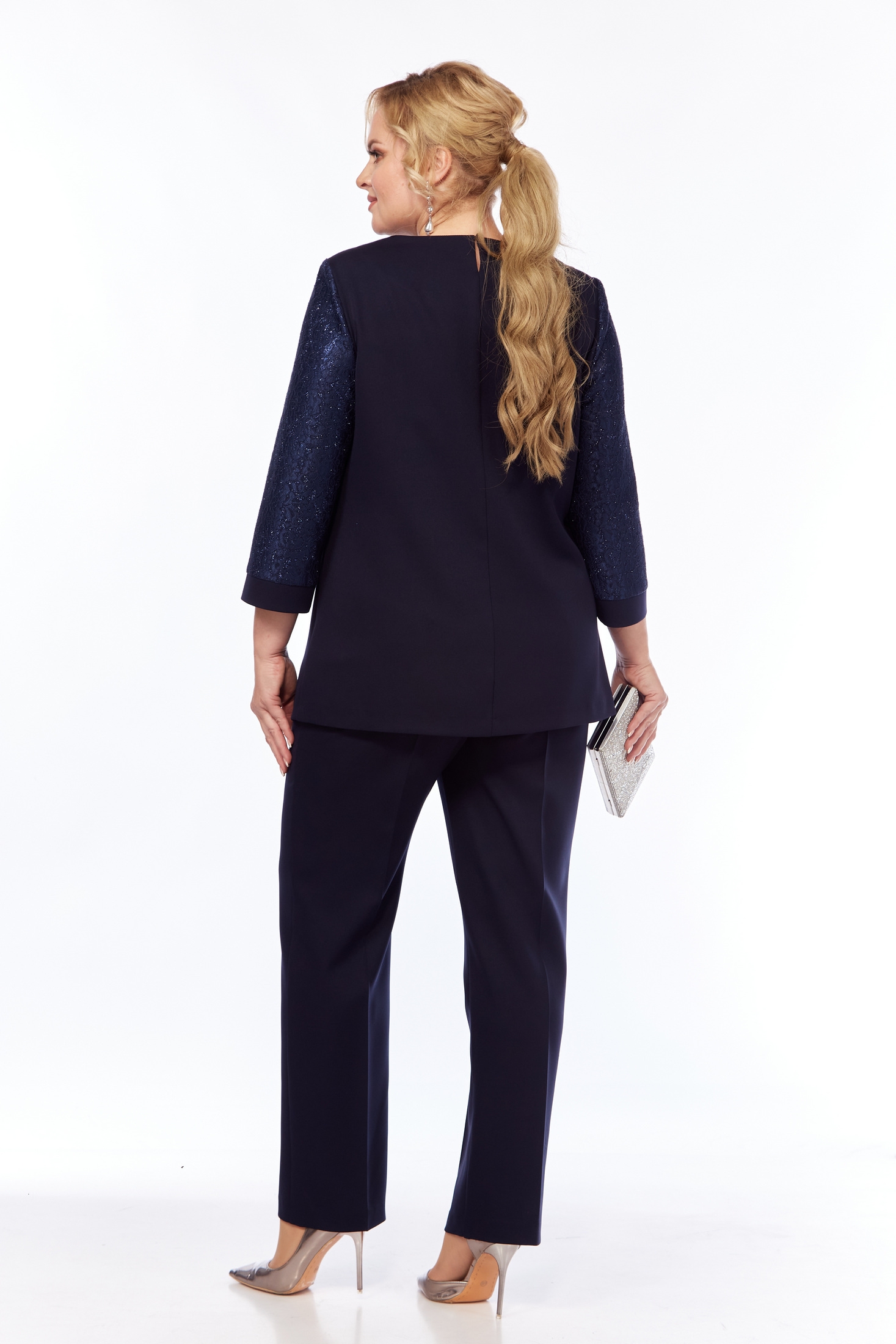 Брюки классические с заутюженными стрелками, слегка зауженные к низу, оформлены притачным поясом, частично на резинке. Застежка спереди брюк на молнию и петлю-пуговицу