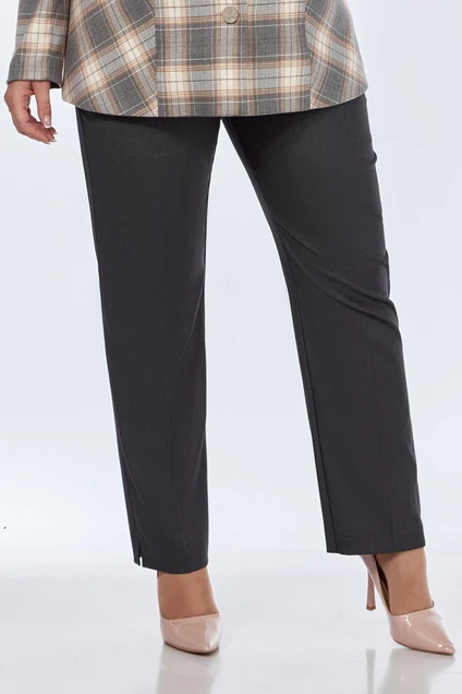 Брюки классические с заутюженными стрелками, слегка зауженные к низу, оформлены притачным поясом, частично на резинке. Застежка спереди брюк на молнию и петлю-пуговицу.