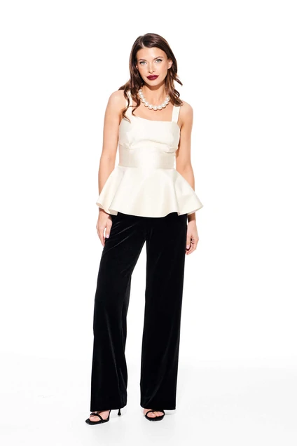 Брюки из бархата на трикотажной основе, умеренного объема, прямого силуэта. На передних половинках выполнены боковые карманы с отрезным бочком. Задние половинки с талиевыми вытачками. Застежка – гульфик на молнии. Пояс притачной, с резинкой по спинке, шлевками, застежкой на крючок и потайную пуговицу.