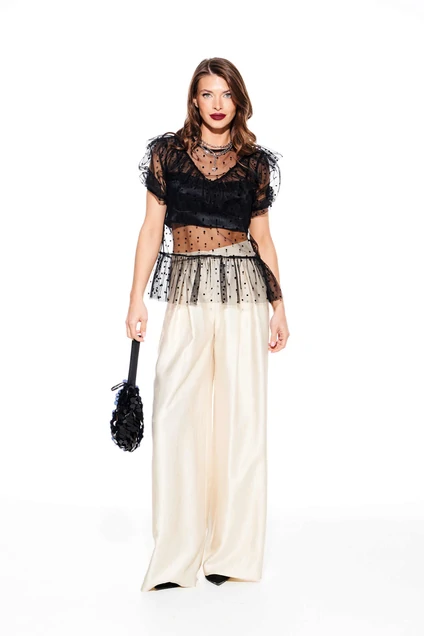 Элегантные брюки свободного кроя в идеализированном стиле для современных fashion-образов. Эти брюки выполнены в нежном бежевом оттенке, добавляя изысканность любому образу. Особенностью дизайна являются расширенные к низу силуэты, что придает образу динамичность и свободу движений. Боковые карманы с отрезным бочком и встречные складки на передних половинках обеспечивают удобство и функциональность, в то время как задние талиевые вытачки гарантируют идеальную посадку. Застежка-гульфик на молнии и притачной пояс с резинкой по спинке, завершенный застежкой на крючок и потайной пуговицей, обеспечивает надежную фиксацию.