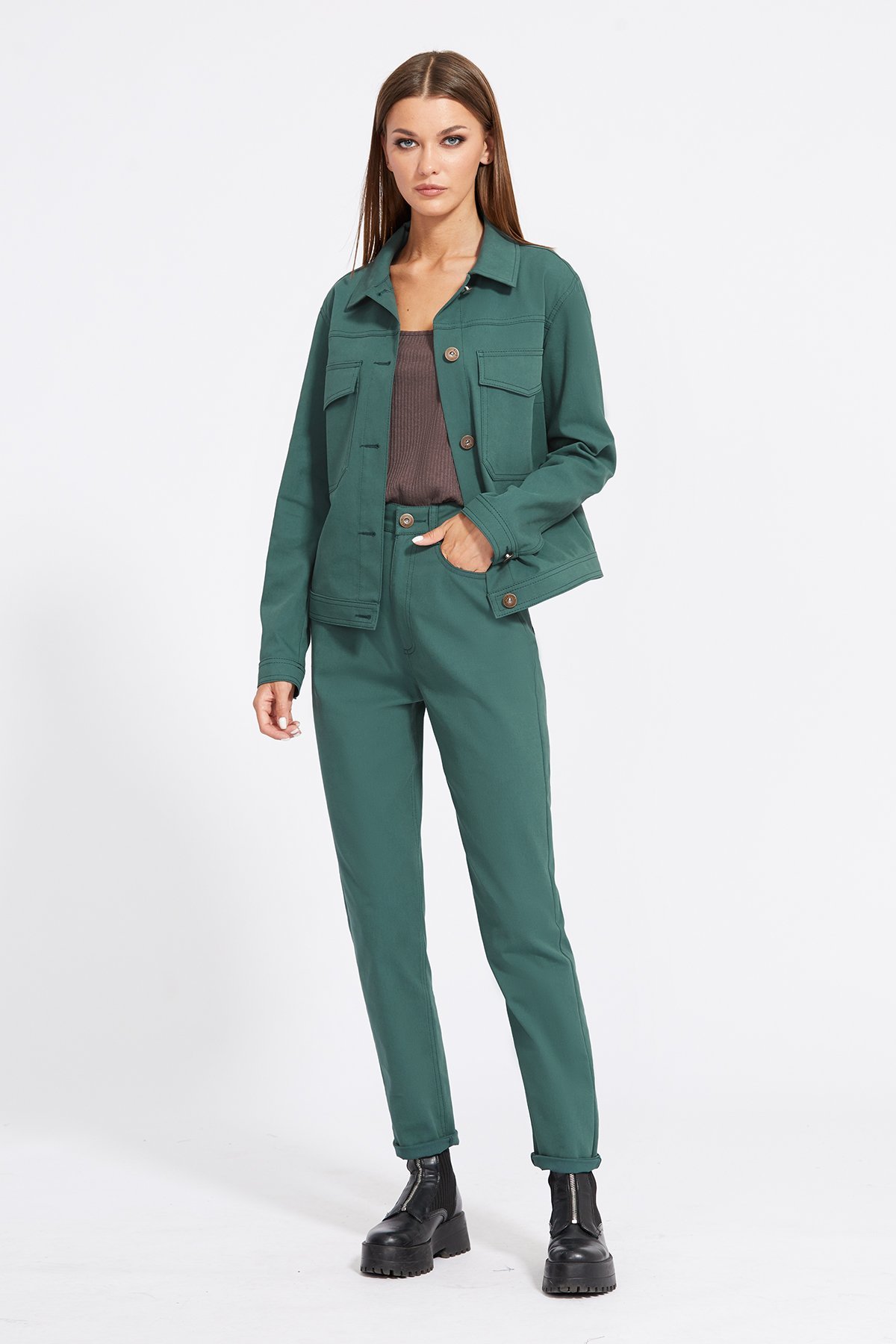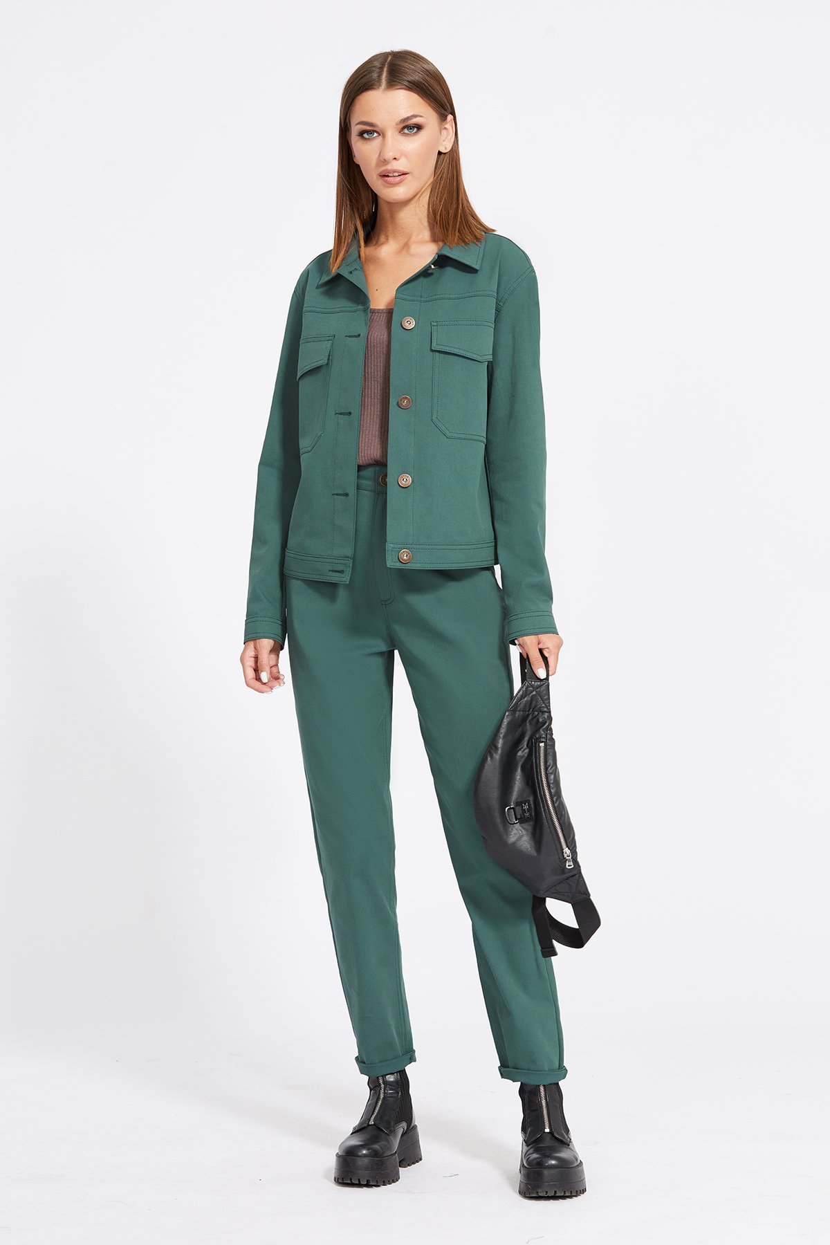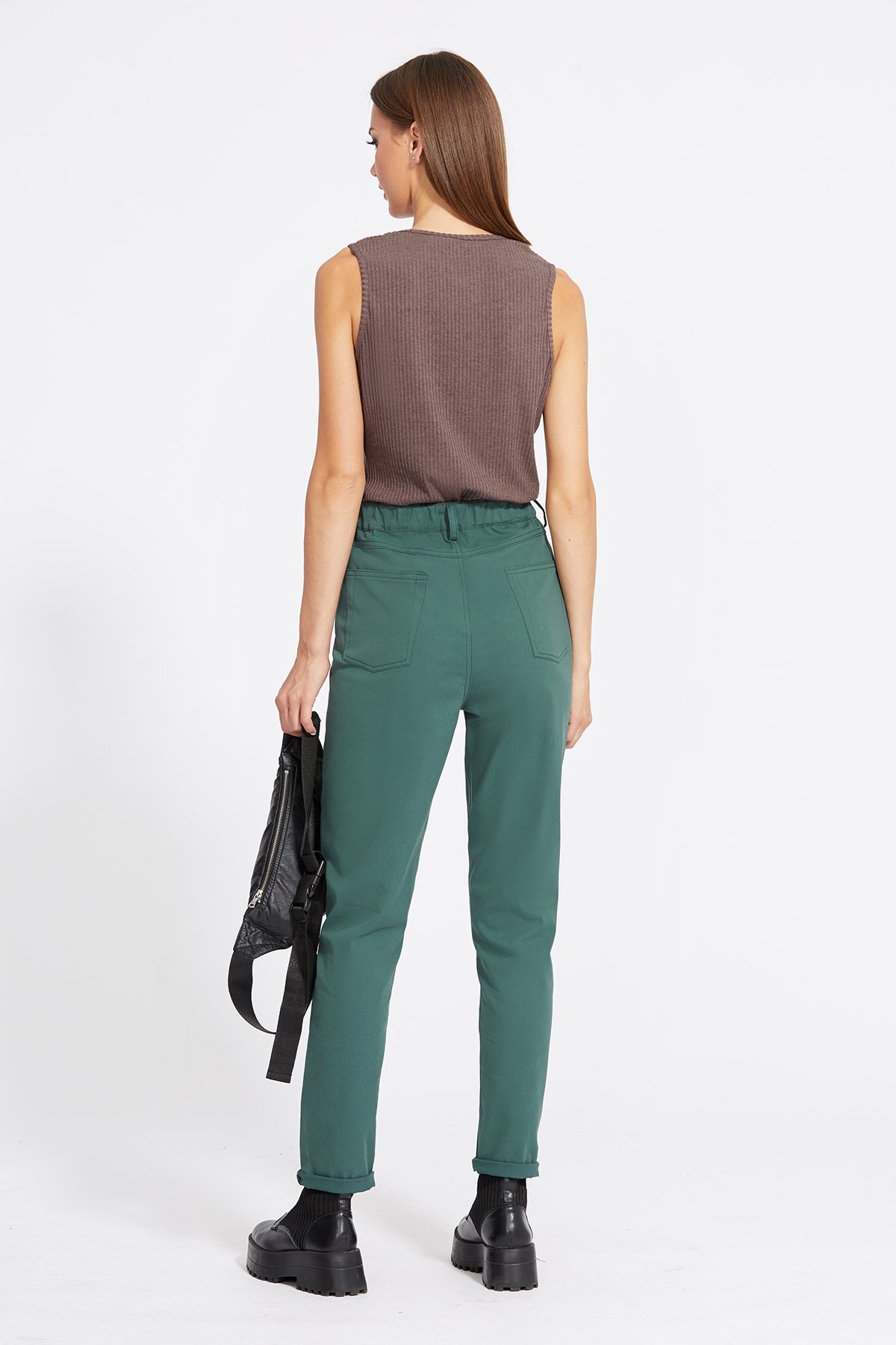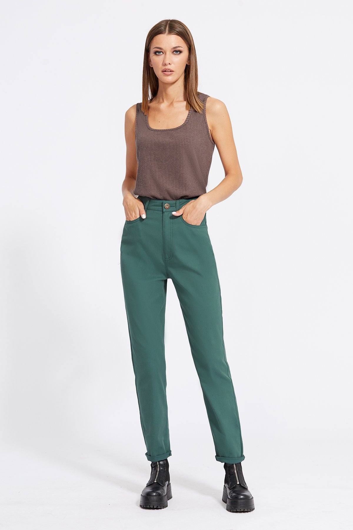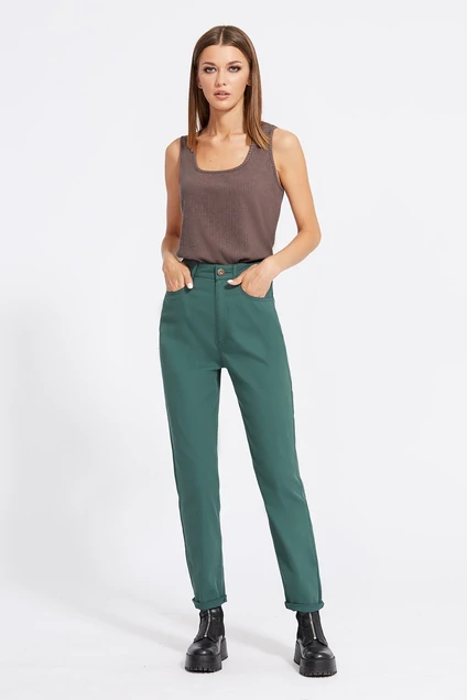 Брюки выполнены из джинса. Брюки на притачном поясе, длиной 7/8, заужены к низу. Застежка спереди на металлическую молнию с гульфиком и пуговицу. Спереди боковые карманы с фигурным наклонным входом. Сзади накладные карманы. В задней части пояса вставлена эластичная тесьма.