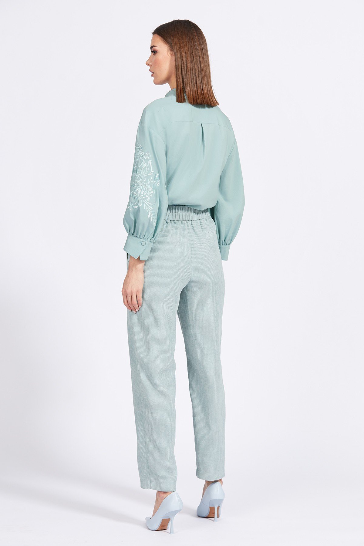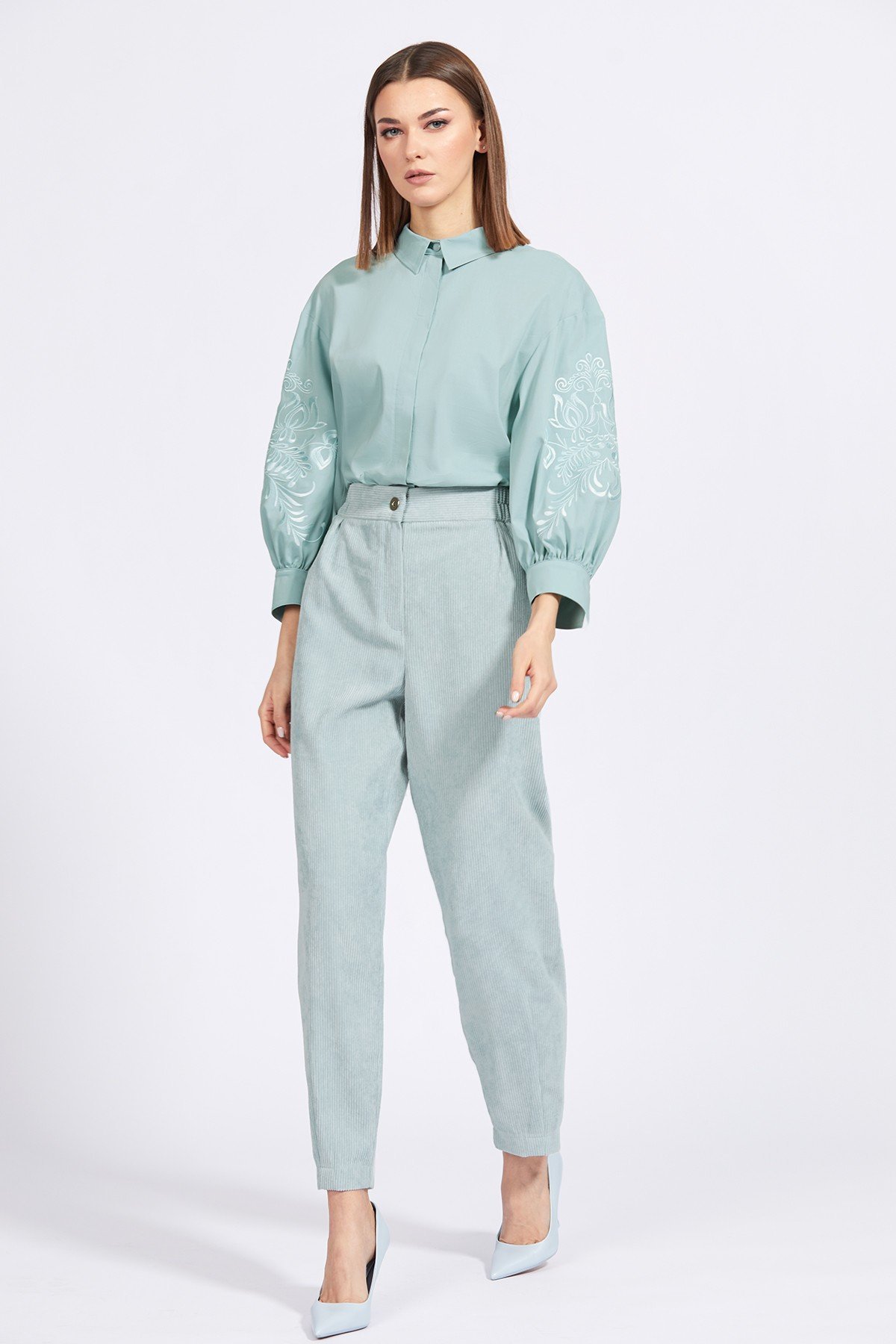 Брюки выполнены из однотонной плательно-костюмной ткани в рубчик "штрукс". Брюки покроя "багги", зауженные к низу. Застежка спереди на пуговицу и молнию с гульфиком. Брюки на притачном поясе, в который частично вставлена эластичная тесьма. Карманы боковые с наклонным входом. Сзади имитация карманов.
