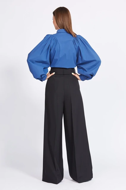 Брюки-палаццо выполнены из костюмной ткани. Брюки на притачном поясе, длиной в пол, расширенные к низу. Спереди складки и боковые карманы с наклонным входом. Застежка спереди на молнию с гульфиком и пуговицу. На задних частях обработаны талиевые вытачки. В комплект входит съемный пояс из основной ткани.