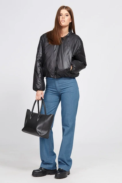 Брюки выполнены из джинса. Брюки прямого силуэта, на отрезном поясе. Спереди боковые карманы с фигурным входом. Застежка спереди на молнию с гульфиком и пробивную пуговицу. Сзади накладные карманы.