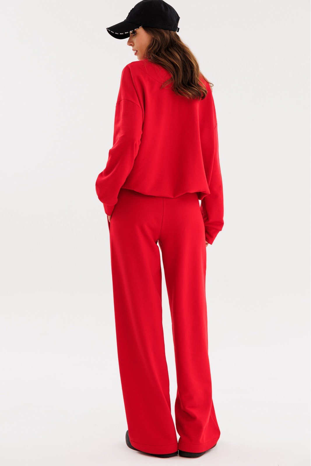 Брюки выполнены из трикотажного полотна. Брюки прямого силуэта, длиной в пол, на притачном поясе. В боковых швах обработаны карманы.