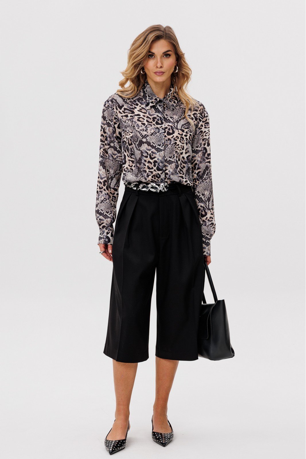 Капри выполнены из костюмно-плательной ткани. Капри длиной ниже линии колена, расширенные к низу на притачном поясе. Спереди обработаны две пары складок и застежка на молнию с гульфиком. В боковых швах обработаны карманы.