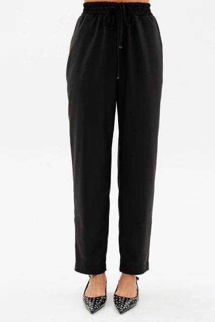 Брюки выполнены из костюмной ткани. Брюки зауженные к низу, длиной 7/8, на притачном поясе с эластичной тесьмой. Спереди боковые карманы с наклонным входом, петли в поясе, в которые втянут шнур из основной ткани.