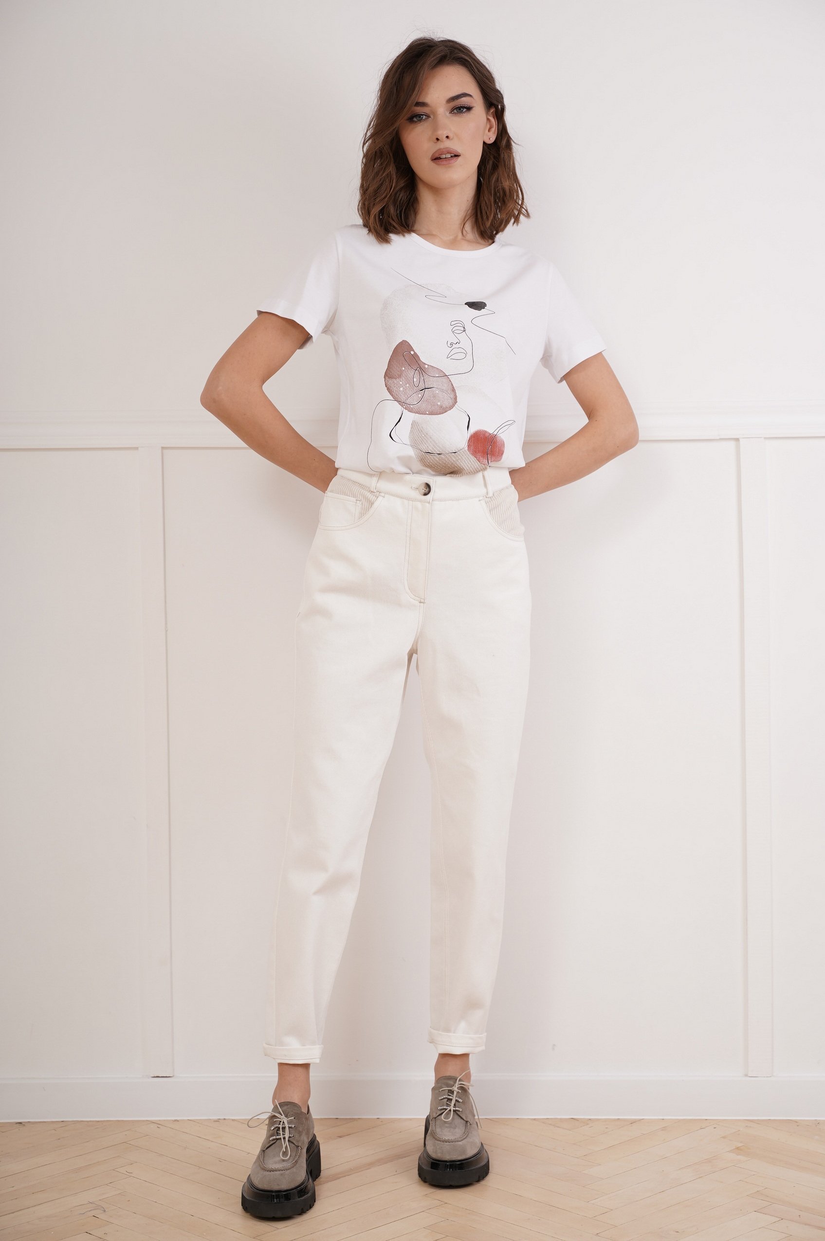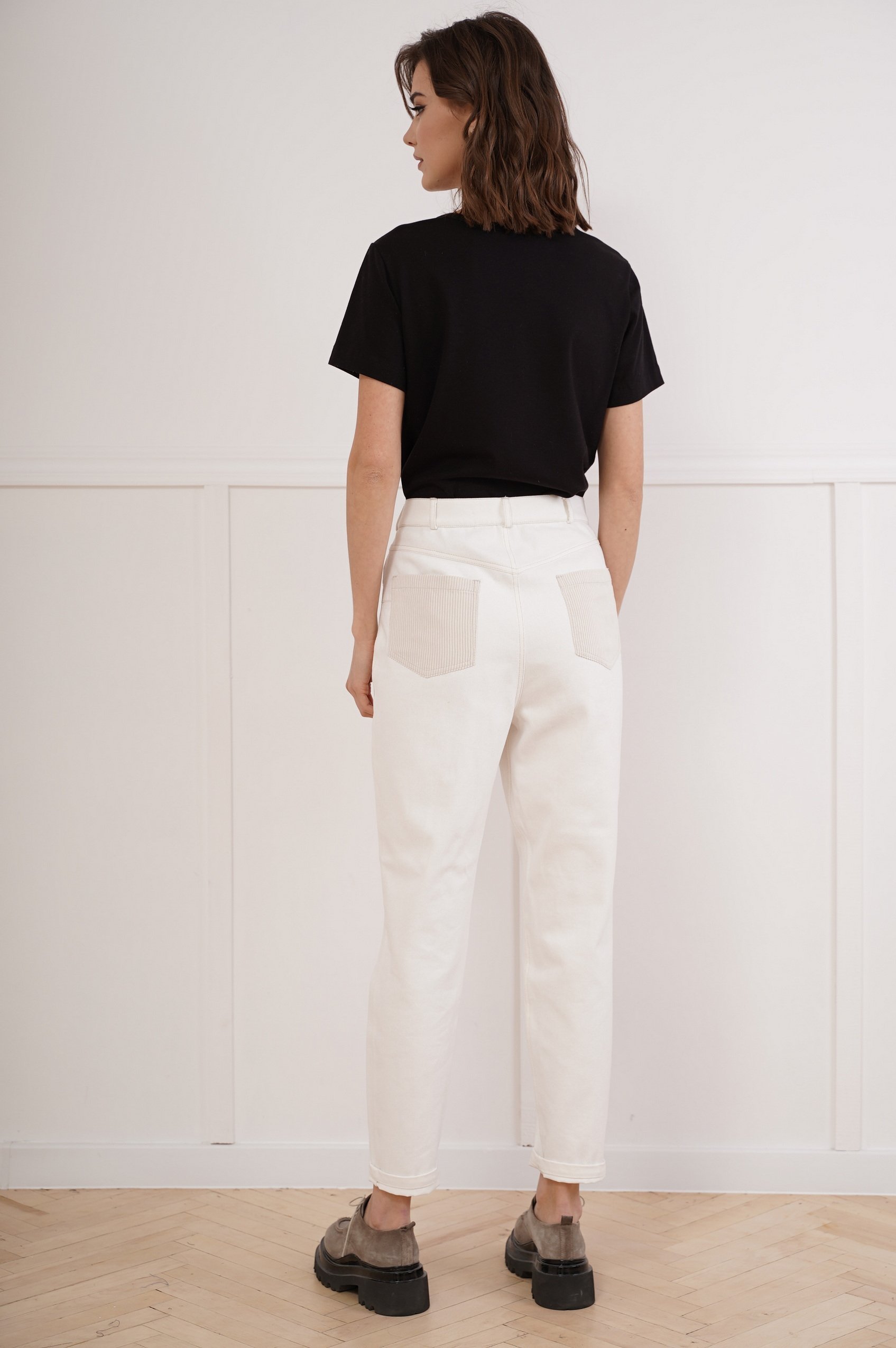Джинсы - мы всегда говорим им ДА! На отдыхе или на работе, независимо от возроста и типа фигуры, зимой или летом незаменимы для сочетания в различных образах, каждый раз создавая разное настроение. В очередной раз мода совершила виток из 90-х и у нас на пьедестале почета свободные джинсы с высокой талией. Классические 5 карманов, отрезная кокетка и накладные карманы на задних половинках, боковой фигурный карман спереди, прямой пояс со шлевками. Длина брюк около 102 см.