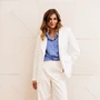 Брюки палаццо с притачным поясом. Спереди застежка гульфик на молнии и петлей и пуговицей по поясу. По задней частям брюк вытачки. Пояс с резинкой в боковых частях. Брюки с заутюженными стрелками. длина брюк с учетом пояса - 109 см.