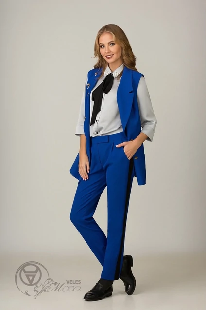 Брюки из костюмной эластичной ткани с лампасом из костюмной ткани черного цвета, зауженные к низу. Брюки с заниженной линией талии с притачным поясом. Застежка в среднем шве передней половинке на молнию, одну пуговицу и одну кнопку. Карманы-хулиганы с округлым оформлением входа в карман. На задней половинке брюк вытачки и листочки