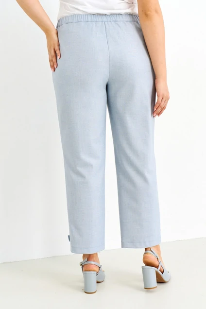 Женские брюки полуприлегающего силуэта выполнены из костюмной ткани с добавлением вискозы 63%. По переду изделия декоративная отделочная строчка; по низу функциональная пата с пуговицей, которая позволяет регулировать прилегание брюк; в боковых швах карманы; по поясу спинки вставлена резинка; застежка на молнию, петлю и пуговицу. Брюки полностью соответсвуют заявленному размеру. Пользуйтесь таблицей замеров готового изделия. Уход за натуральными тканями: - рекомендована бережная стирка при температуре не выше 30 градусов, - глажение при температуре прессующей поверности 110 градусов.