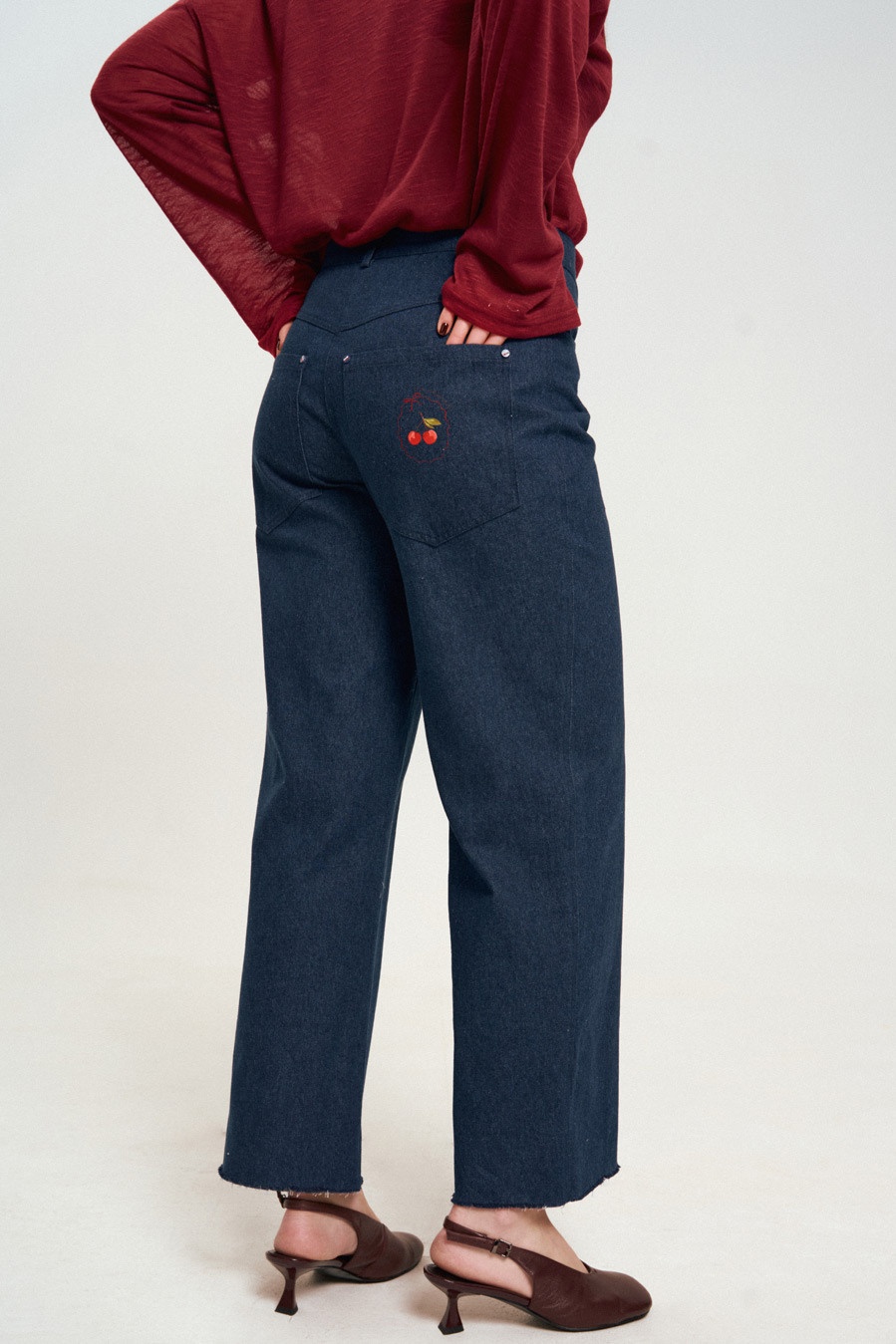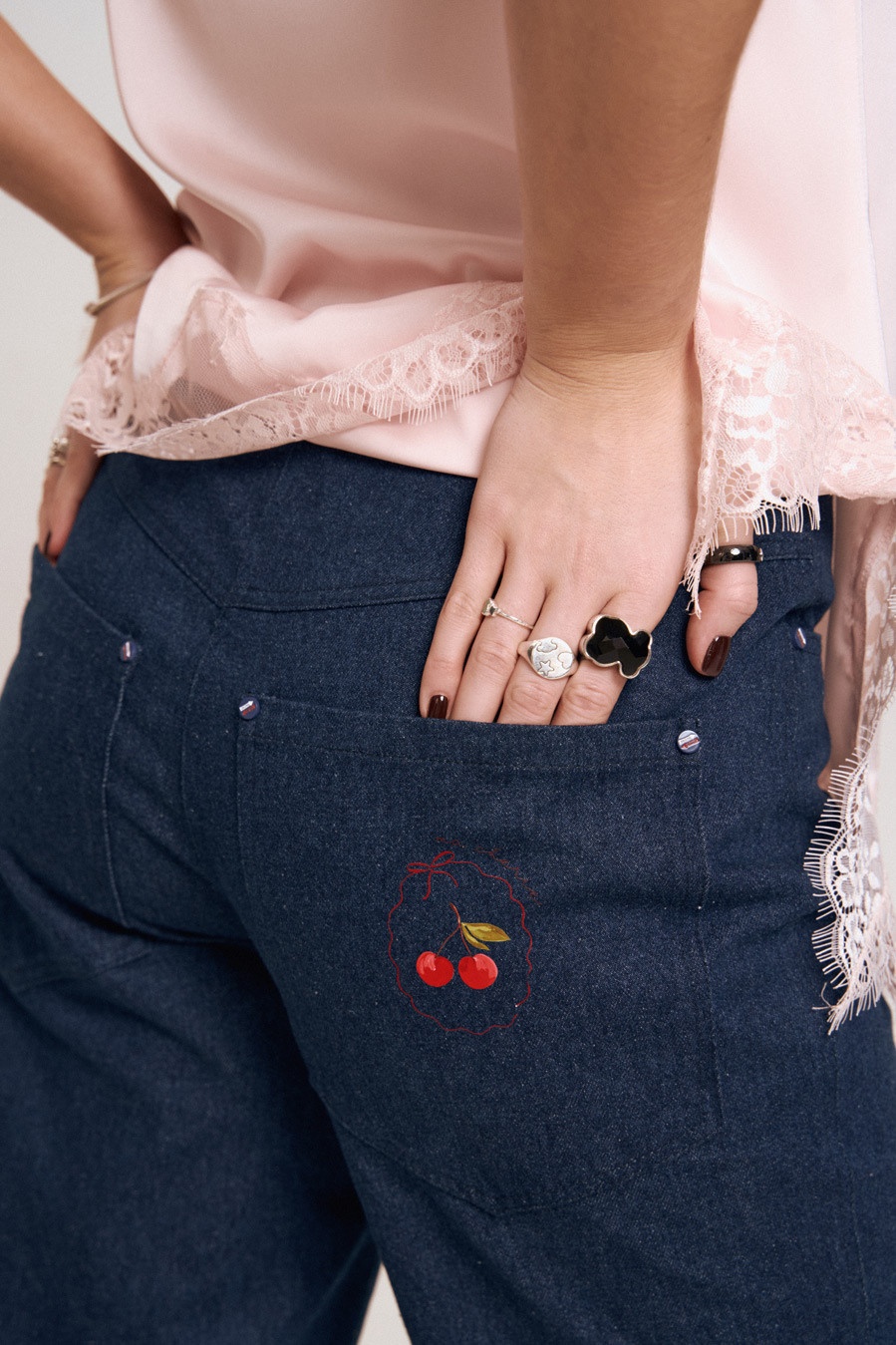 Джинсы(брюки) молодежные из полотна джинс, прямого силуэта с необработанны краем по низу с карманами фигурной формы и застежкой "гульфик" по переду, кокеткой диагональной формы по ЗП и накладными карманами с декором( принт) на правом кармане.