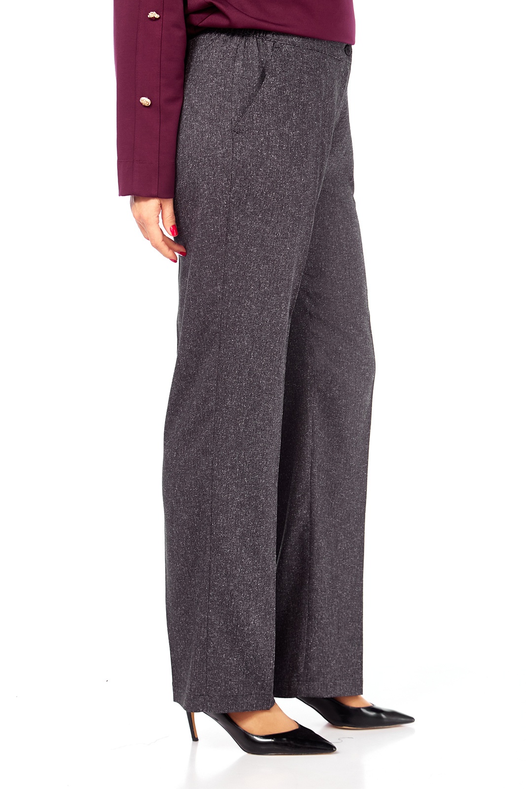 Брюки женские, выполнены из костюмной ткани, пояс притачной частично на резинке. Застежка на тесьму-молнию и петлю-пуговицу. В брюках обработаны карманы.