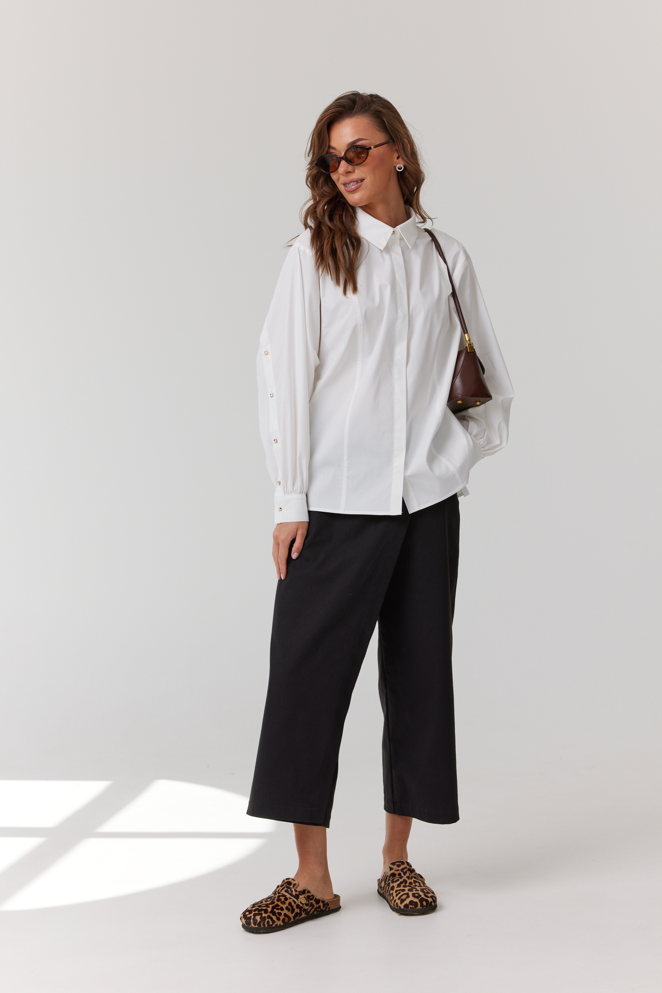 Брюки укороченные, прямые с запахом. По переду обработаны карманы с фигурным входом, декорированные металлическими хольнитенами и застежка на молнию. По задним половинкам брюк обработаны вытачки. Верх брюк обработан притачным поясом, застегивающимся на петлю и пуговицу. Верх запашной части обработан вторым притачным поясом, застегивающимся на петлю и пуговицу. Декоративные элементы и фурнитура могут отличаться от заявленных на фото. Цвет материала может отличаться по тону в зависимости от настроек вашего монитора! Длина изделия по боковому шву 90 см. Ширина по линии бедер: 44р. - 100 см, 46р. - 104 см, 48р. - 108 см, 50р. - 112 см, 52р. - 116 см, 54р. - 120 см.