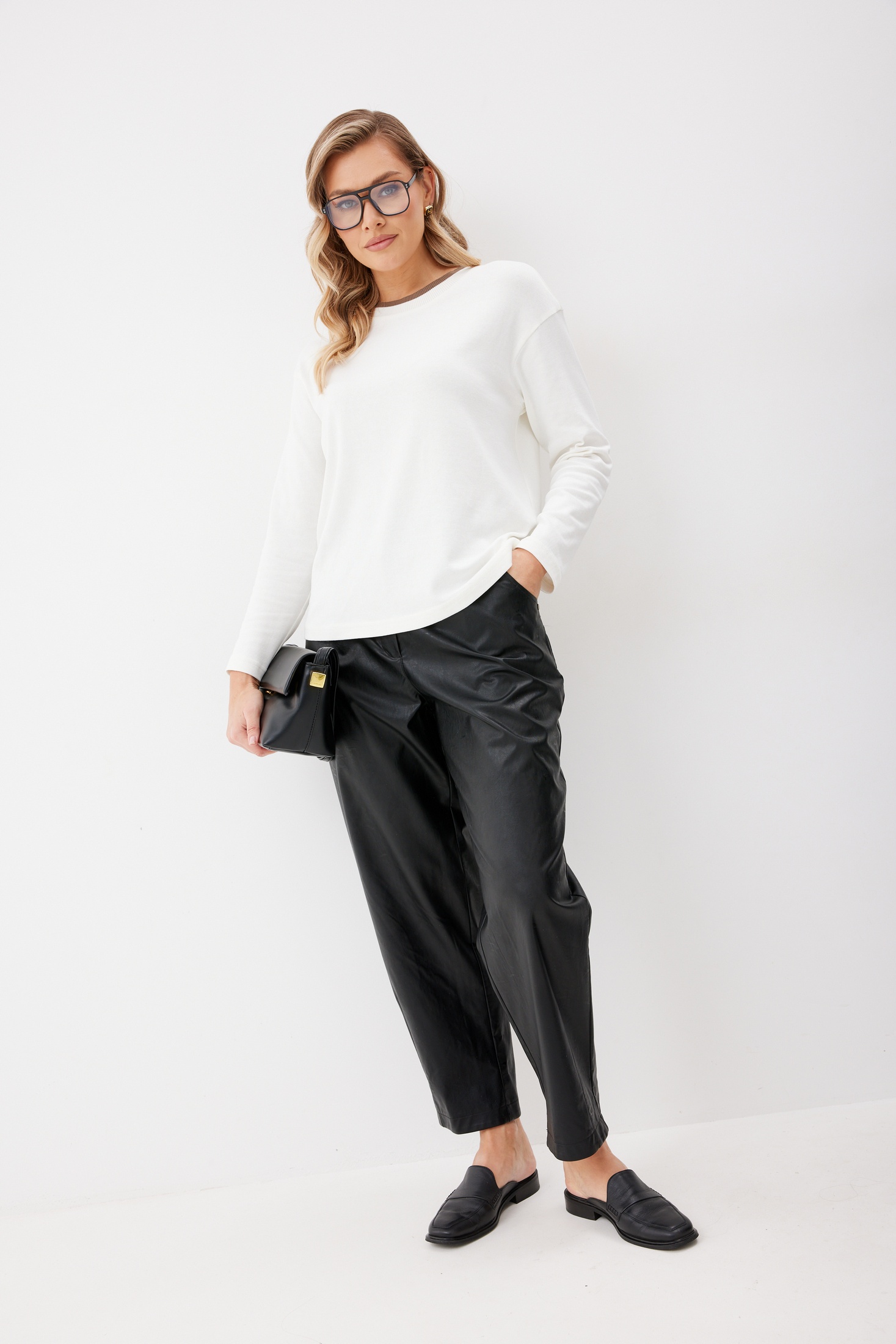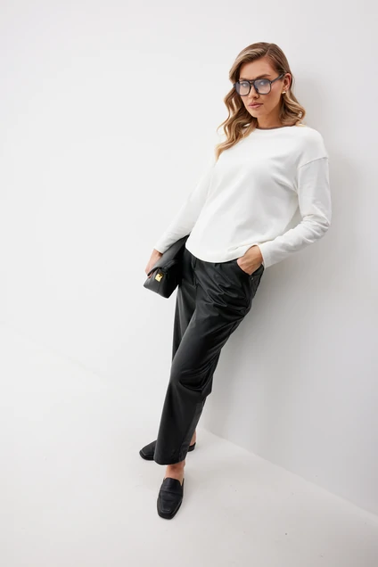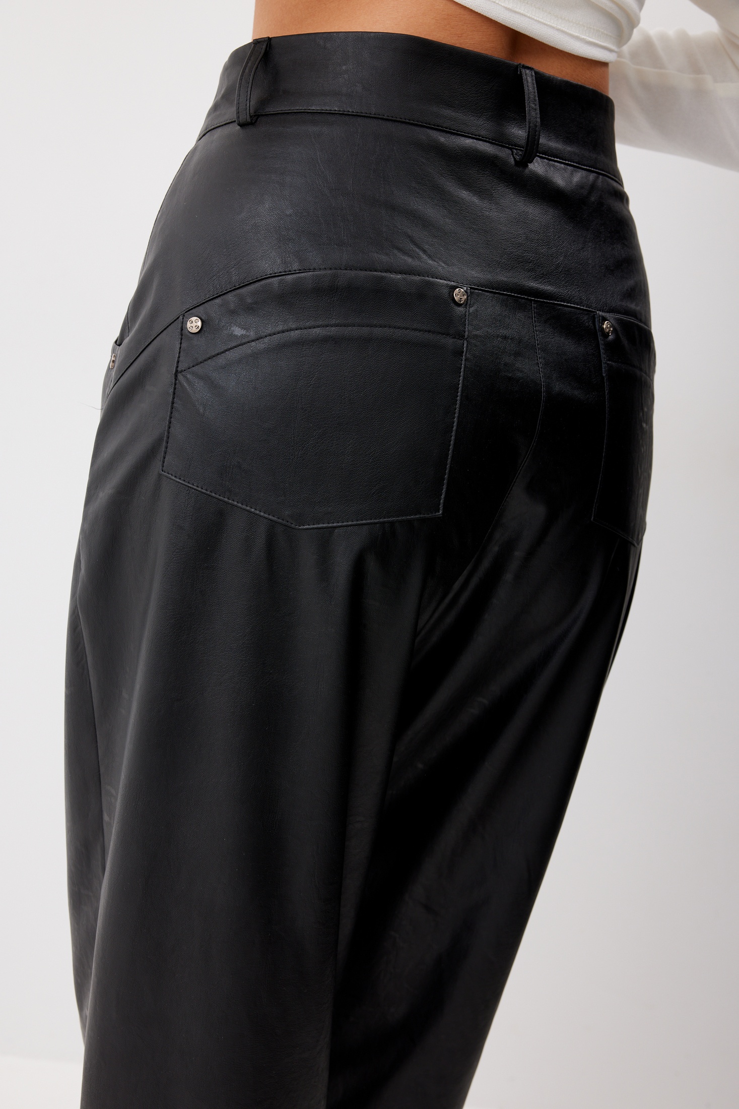 Брюки женские из искусственной кожи зауженные к низу. На передних частях брюк обработаны карманы с отрезным бочком и застрочены складки. По концам кармана установлены хольнитены. По спинке брюк накладные карманы с хольнитенами на концах и отрезной кокеткой. Верхний срез брюк обработан отрезным поясом со шлевками. Брюки застегиваются по переду на «молнию» в гульфике и кнопку по поясу.Длина по боковому шву 97,5 см.