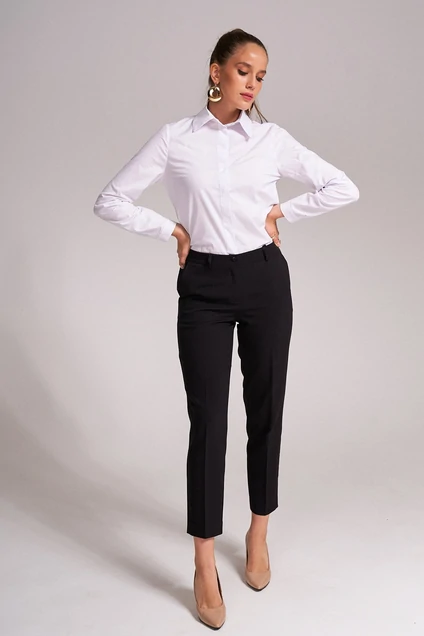 Брюки базовые со стрелками. Изделие имеет комфортную средней посадку. Брюки на притачном поясе со шлёвками. Спереди боковые функциональные карманы, сзади имитация прорезных карманов с листочкой.