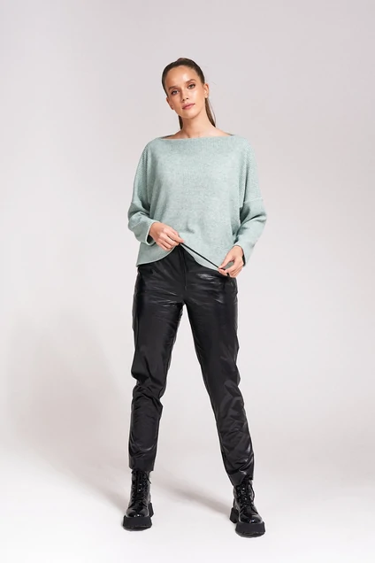 Стильные брюки выполнены из экокожи на хлопковой основе. Брюки с притачным поясом на резинке и шнурком из основной ткани. Изделие с боковыми функциональными карманами, сзади имитация прорезных карманов с листочкой.
