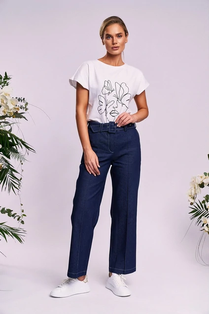 Брюки женские, умеренного объема, полной длины, прямые, из ткани Тифани. Передняя часть брюк с отстроченными кантами и боковыми карманами. Задняя часть брюк с кокеткой и накладными карманами прямоугольной формы. Пояс притачной с шлевками, сзади призборен н резинку. Застежка-гульфик на молнию спереди. В комплект тдет съемный пояс из основной ткани.