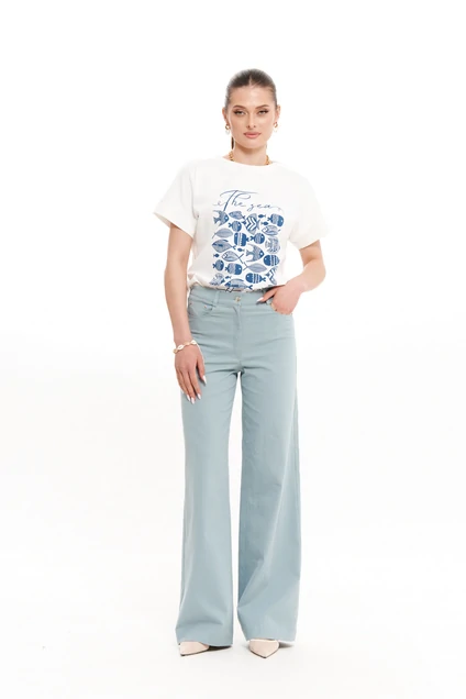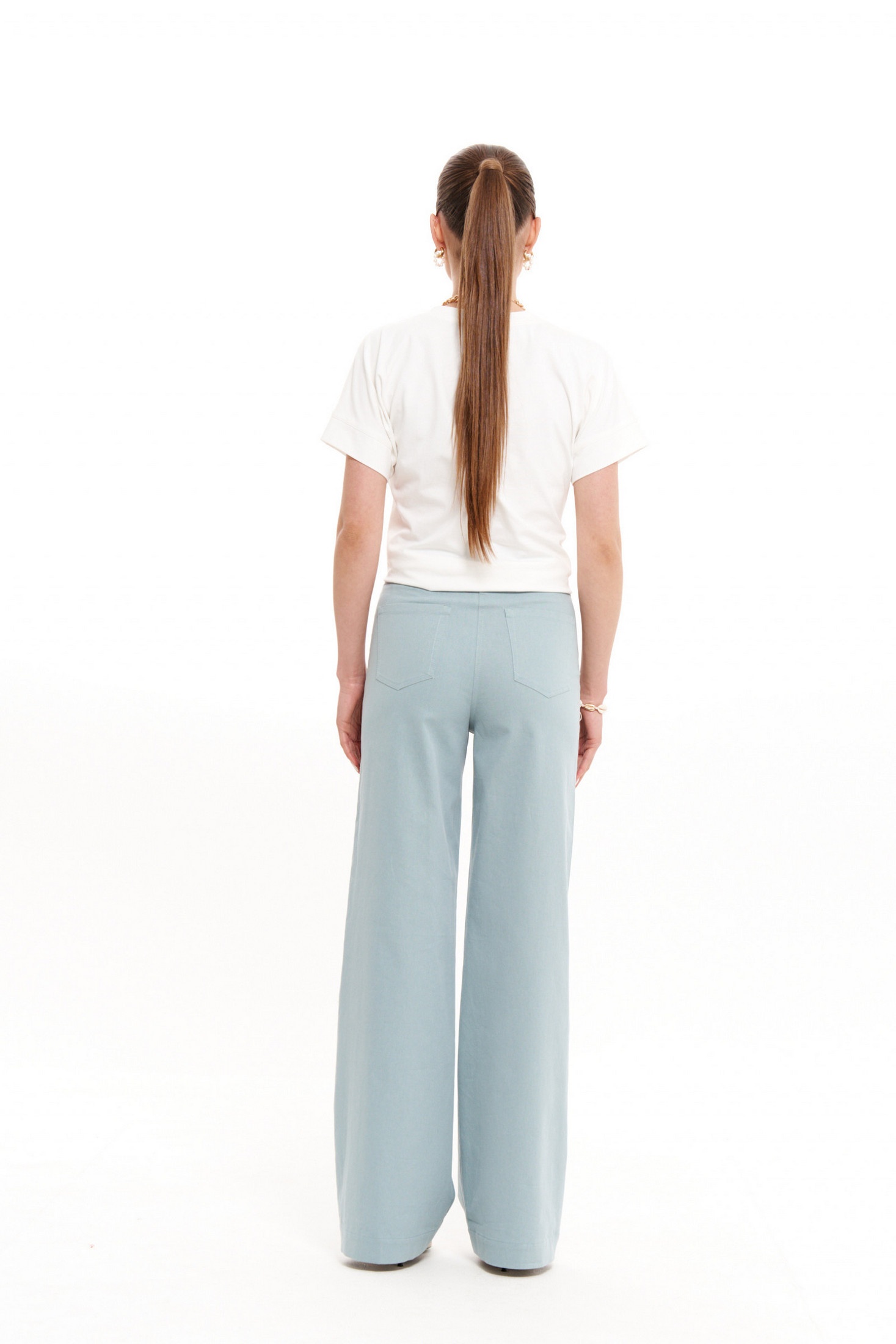 Брюки женские из смесовой ткани с большим содержание хлопка для повседневной носки. Брюки прямые. Верхний срез брюк обработан притачным поясом с застежкой на одну обметанную петлю и одну пуговицу, а также имеется застежка на тесьму-молнию в среднем шве брюк. Брюки со шлевками, что дает возможность носить их под пояс, тем самым вы сможете регулировать облегание в области талии. Передняя часть брюк имеет два боковых кармана с подкройным бочком. Задняя часть брюк имеет отрезную кокетку, а также два накладных кармана. Очень стильные брюки в серо-голубом оттенке, которые безусловно будут радовать вас своим чудесным видом и прекрасной посадкой.