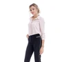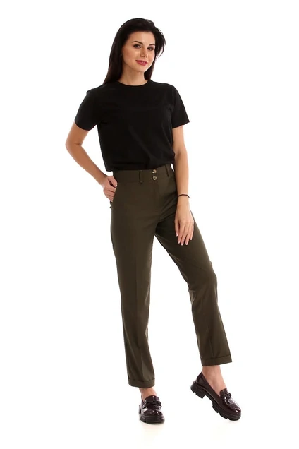 Брюки женские, заужены к низу. Посадка брюк высокая, пояс обработан с резинкой по бокам, низ брюк заканчивается манжетами. Застежка петля, пуговица, молния. По передним частям выполнены боковые карманы с прорезными бочками, по спинке талиевые вытачки с карманами имитацией и планками. Ткань достаточно хорошо тянется. Длина брюк по боковому шву 80 см.