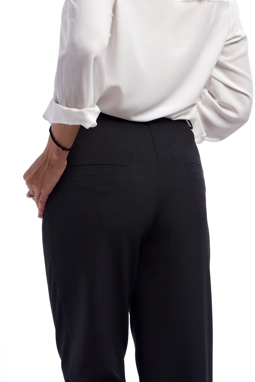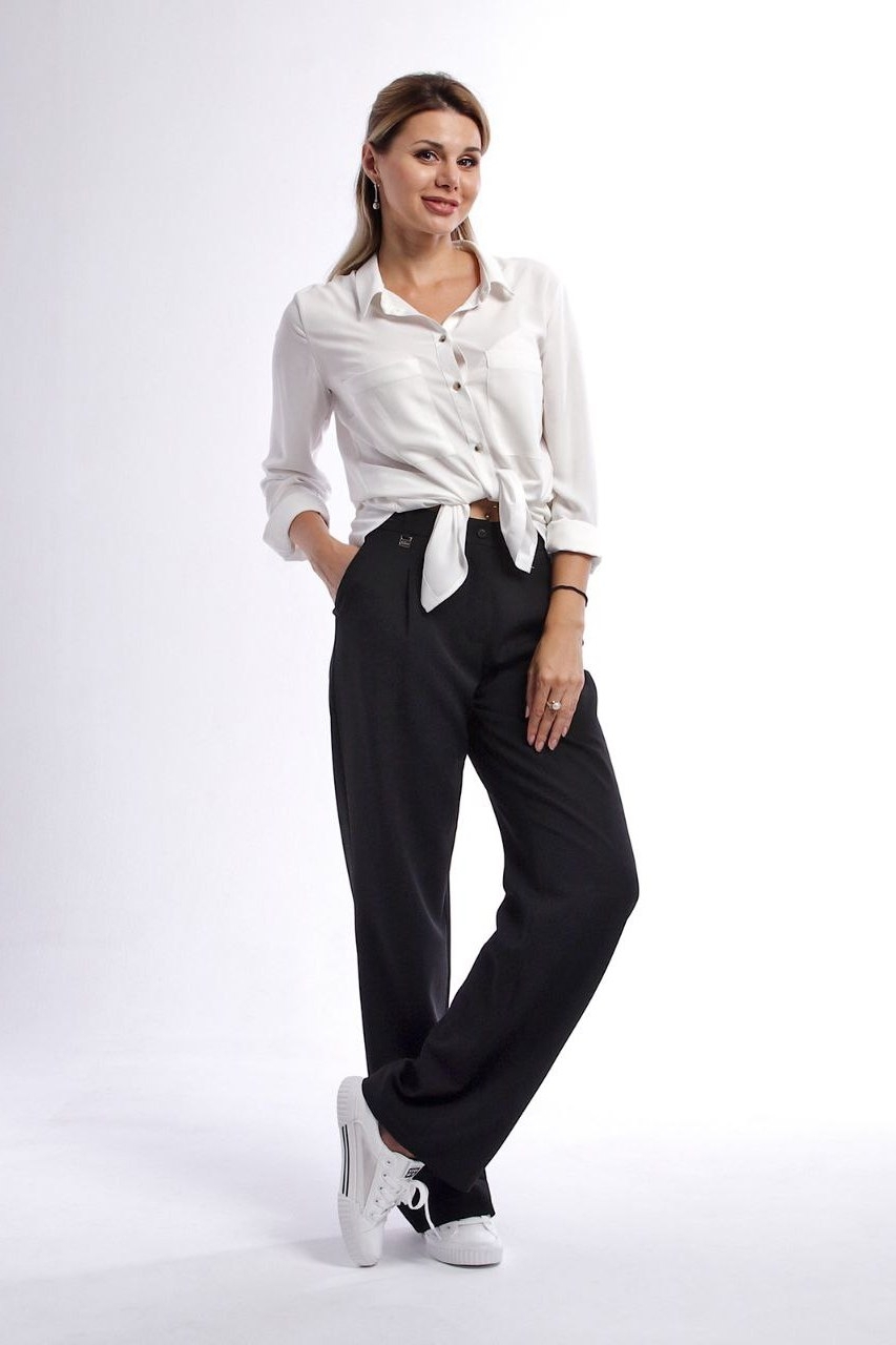 Брюки женские свободного кроя с высокой посадкой. Спереди по линии талии выполнены неглубокие складки. На передних частях выполнены карманы с отрезными бочками. Застежка петля, пуговица, молния. По спинке талиевые вытачки и прорезной карман-имитация с планками. Длина шагового шва 81 см. Ткань - текстиль с добавлением лайкры, хорошо тянется, малосминаемая, не деформируется после стирки.