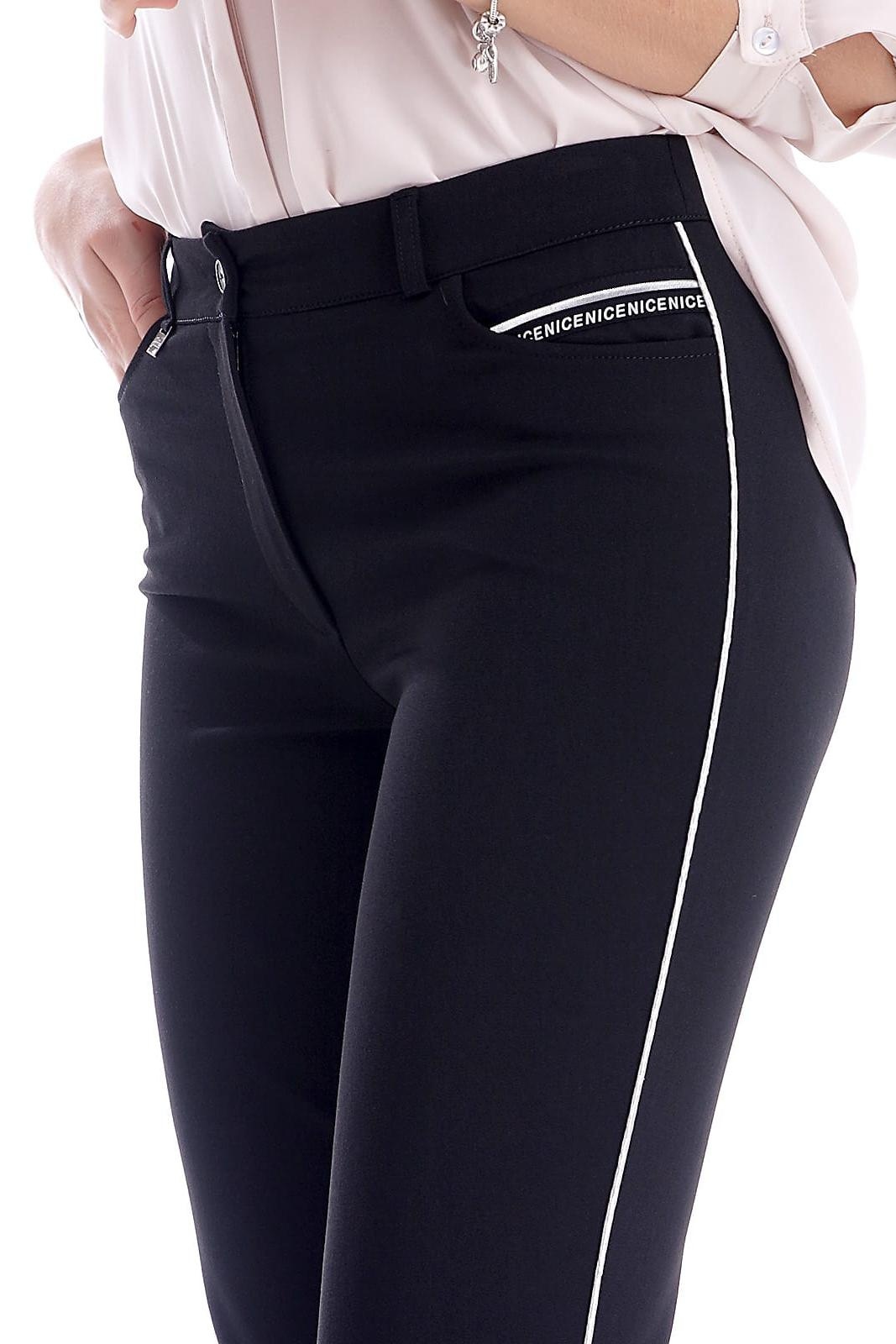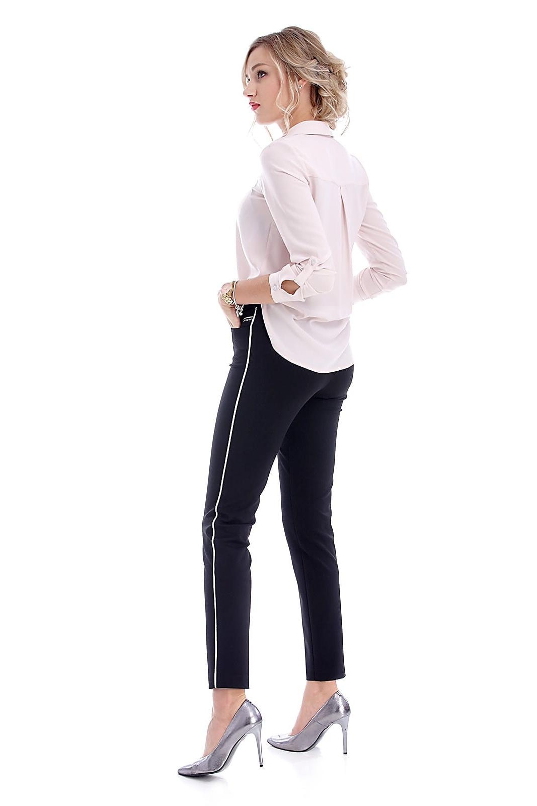 Брюки женские облегающего силуэта, заужены к низу. Застежка петля, пуговица, молния. На передних частях выполнены боковые карманы с отрезными бочками. Украшением служит декоративная лента на левом кармане. По спинке выполнены талиевые вытачки и прорезные карманы-имитация с планками. В боковые швы вшит серебристый кант. Посадка высокая. Длина шагового шва 78-81 см в зависимости от размера.