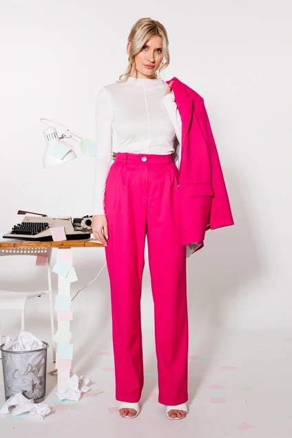 Базовые брюки с посадкой на талии и складками, которые визуально вытягивают силуэт, можно носить не только с туниками и толстовкам, но и с рубашками и укороченными моделями. Мы выбрали для них плотную ткань на основе вискозы — такой материал благодаря добавлению искусственных волокон держит форму и отлично дышит.