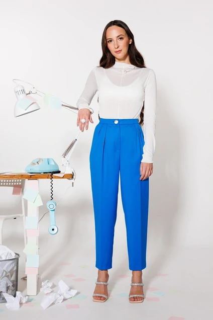 Брюки-бестселлер — зауженные, со стрелками, задающими четкую вертикальную линию, универсальной укороченной длины. Выполнены из смесовой костюмной вискозы с гладкой фактурой. Такую модель можно стилизовать как для вечера, так и для повседневных образов — с изящными босоножками на каблуке или туфлями на плоской подошве.