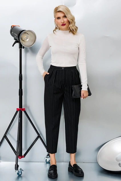 Полосатые брюки чуть зауженные к низу. Брюки на узком поясе. по переду расположены складки и карманы с наклонным входом. Универсальные брюки на каждый день.