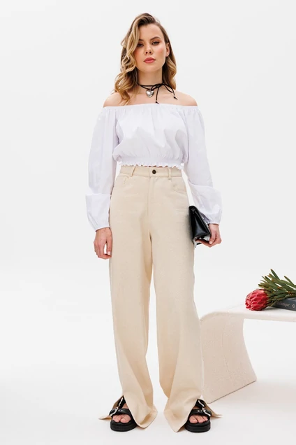 Хлопковые брюки с разрезами. Застежка на джинсовую кнопку и молнию. По переду выполнены карманы. По заднему полотнищу расположены накладные карманы. Внизу выполнены высокие разрезы. Брюки подойдут для повседневной носки и буду сочетаться с любым гардеробом. Материал из которого они выполнены позволит вашей коже дышать, он быстро сохнет и не катается после носки. В брюках завышенная линия талии, что визуально сделает ваши ноги стройнее и длиннее. Длина - 115 см.