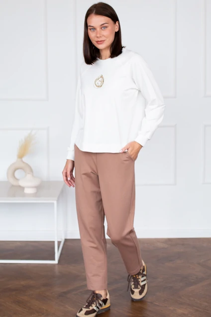 Эти стильные брюки в песочном оттенке являются идеальным выбором для создания современного городского образа. Изготовленные из гладкого, немаркого материала, они обеспечивают комфорт и свободу движений на протяжении всего дня. Прямой крой подчеркивает изящество силуэта, делая акцент на стройности фигуры. Брюки оснащены практичными боковыми карманами для удобства. Нейтральный цвет делает их отличным выбором для сочетания с любыми верхними частями гардероба, будь то строгие блузы или повседневные свитшоты.
