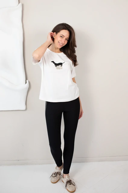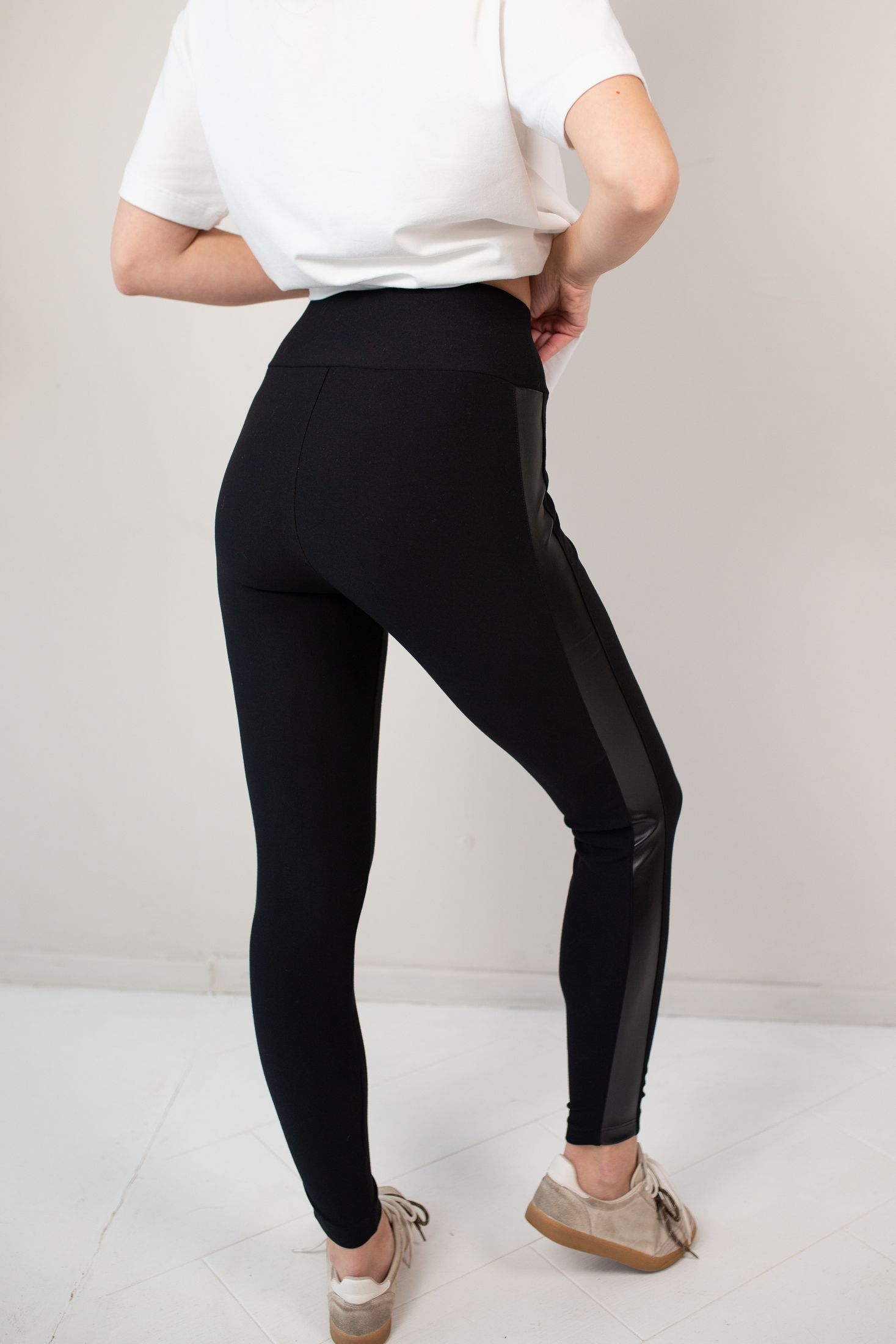 Черные облегающие брюки с высокой посадкой. Сбоку широкая вставка из гладкого материала с ненавязчивым матовым блеском придает образу современность и подчёркивает линию ног. Мягкая ткань обеспечивает комфорт и идеальную посадку, а лаконичный дизайн легко впишется в любой гардероб. Отличный выбор для стильных и динамичных образов.