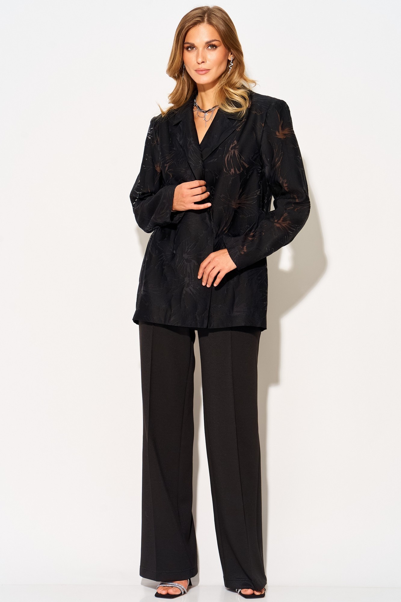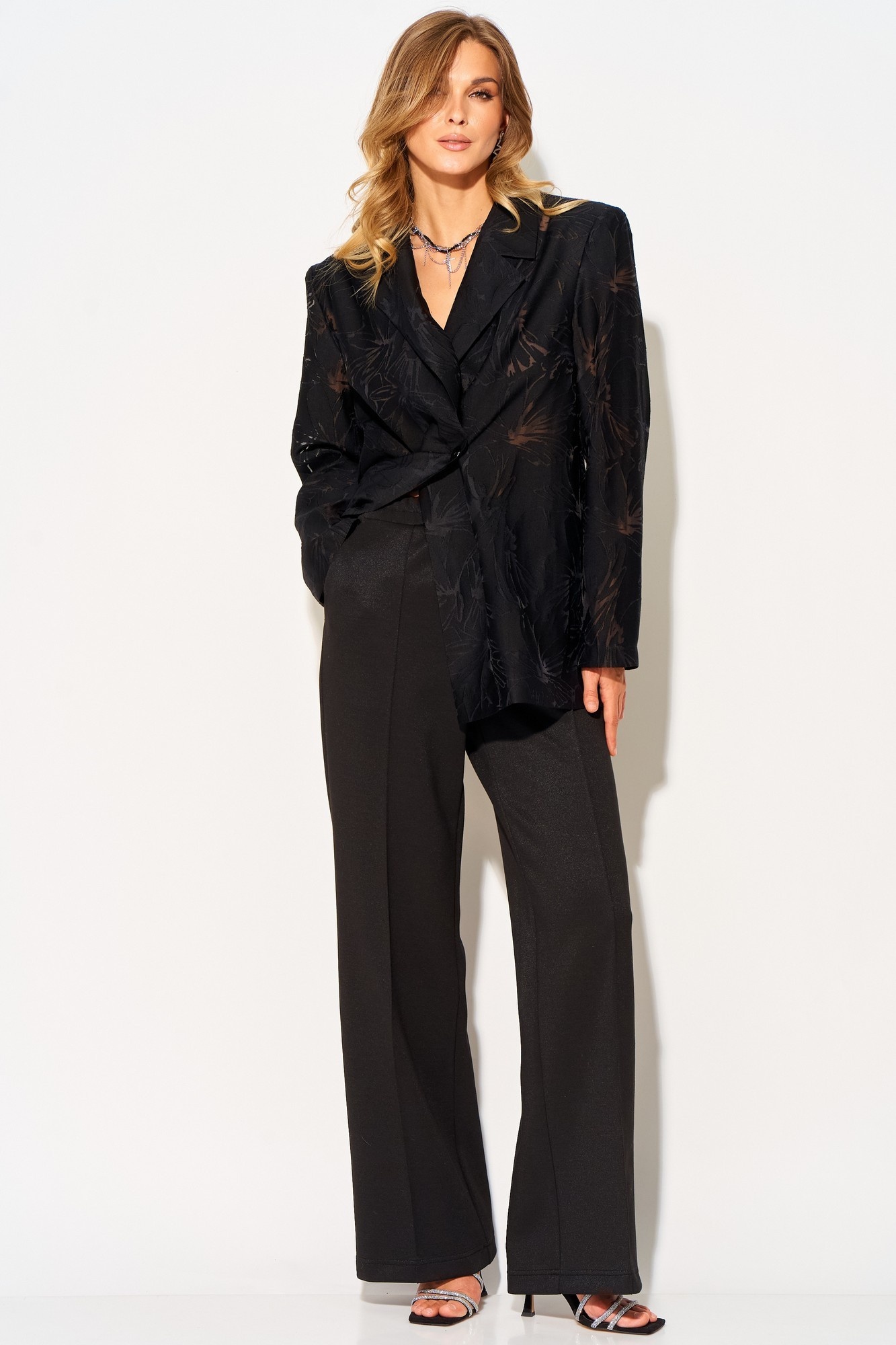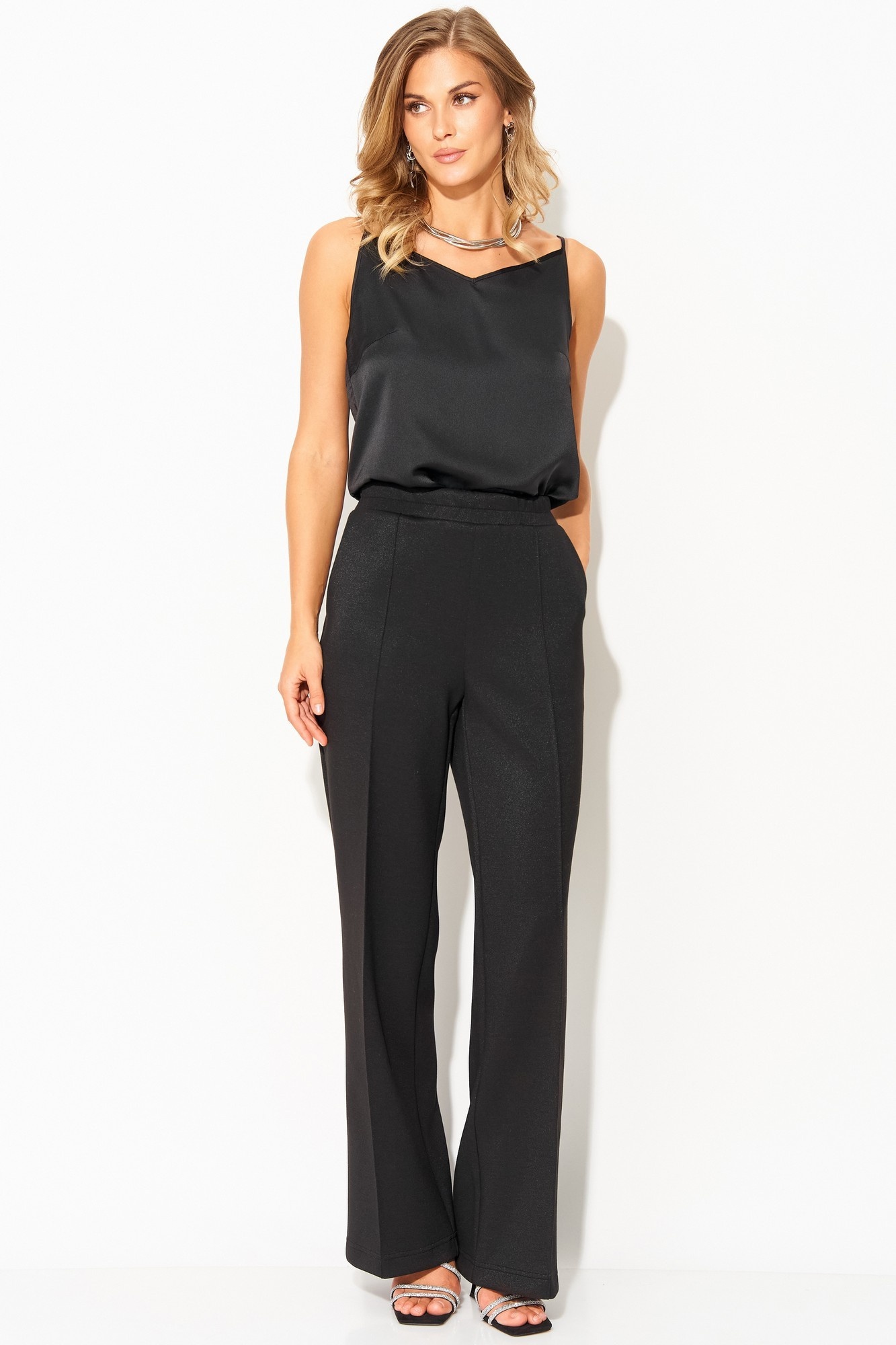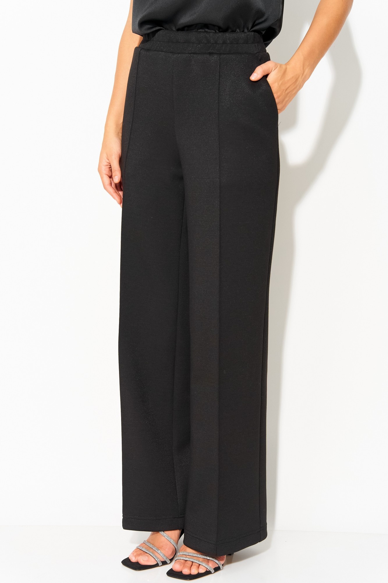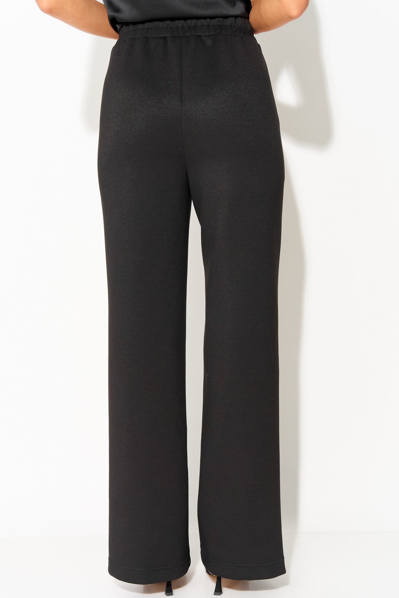 Прямые брюки от LAIKONY из трикотада с блеском. Брюки на талии, облегающие вверху и прямые к низу, с притачным поясом, в который вставлена эластичная тесьма. На передних частях брюк в боковых швах обработаны наклонные карманы, по центру отстрочены «канты. Мягкий и пластичный трикотаж хорошо тянется в двух направлениях, малосминаем, средней плотности. Наши модные брюки идеально подойдут как к повседневному, так и праздничному образу. Идеально сочетается с нашими нарядными жакетами L-893-1.